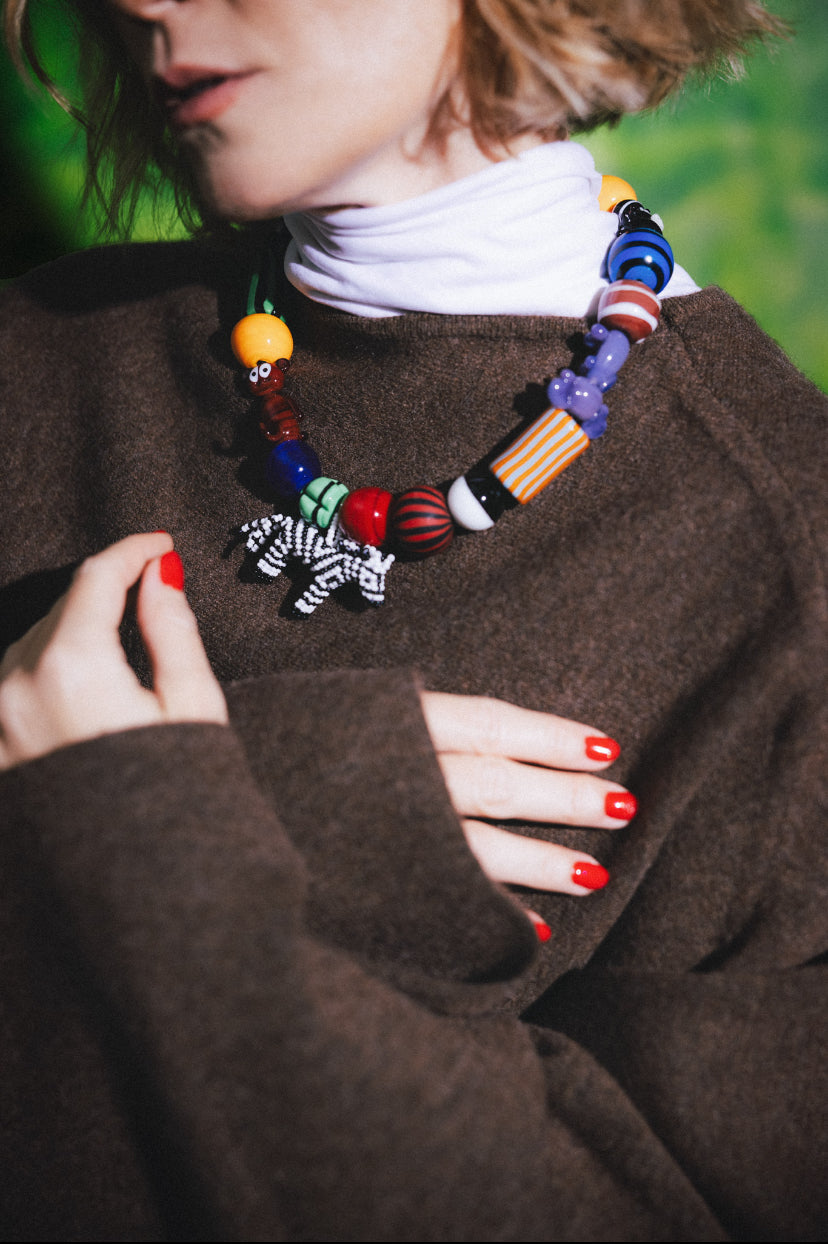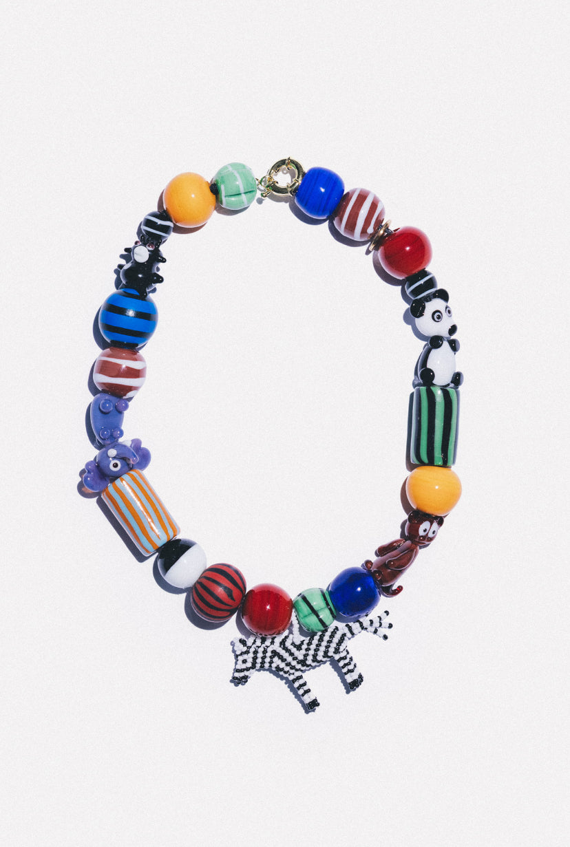 The striped Murano spheres and cylinders, in harmony with the coloured ceramic spheres and the sweetness of the animals, are all exclusive pieces, carefully crafted and hand-painted in our workshop. The meticulously hand-sculpted Zebra, with its distinct volume and shape, are fun pieces created through our social project with artisans in Colombia Each one represents a fragment of this magical adventure, embodying the emotion, desire, and beauty found in nature.The gold-plated metal details, such as the clasps and tags, are part of our premium jewellery line. These are guaranteed by a seven-layer coating of 18k gold.