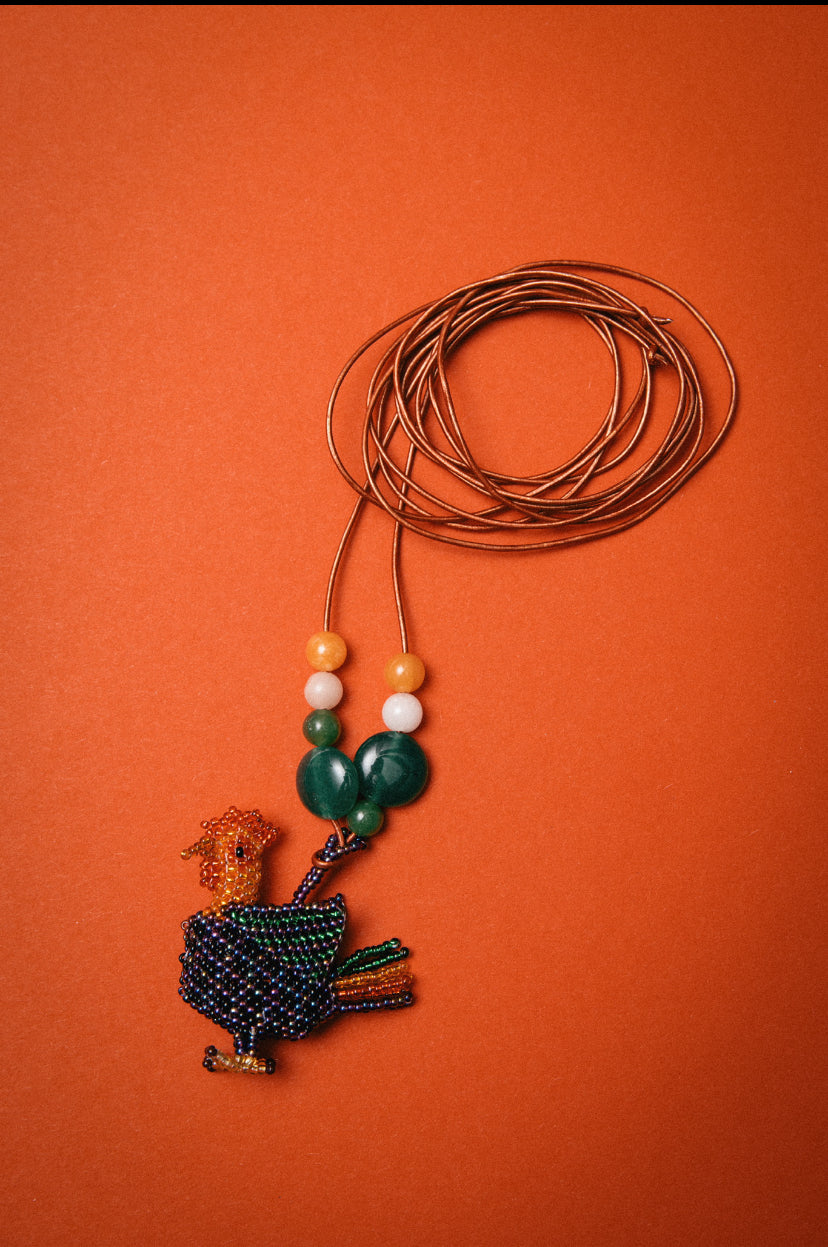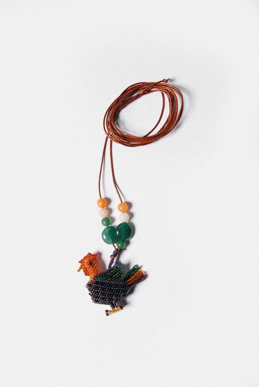 Brown Greek Leather + Rooster made of Acrylic Beads + Crystal Spheres+Natural Agate Stones
