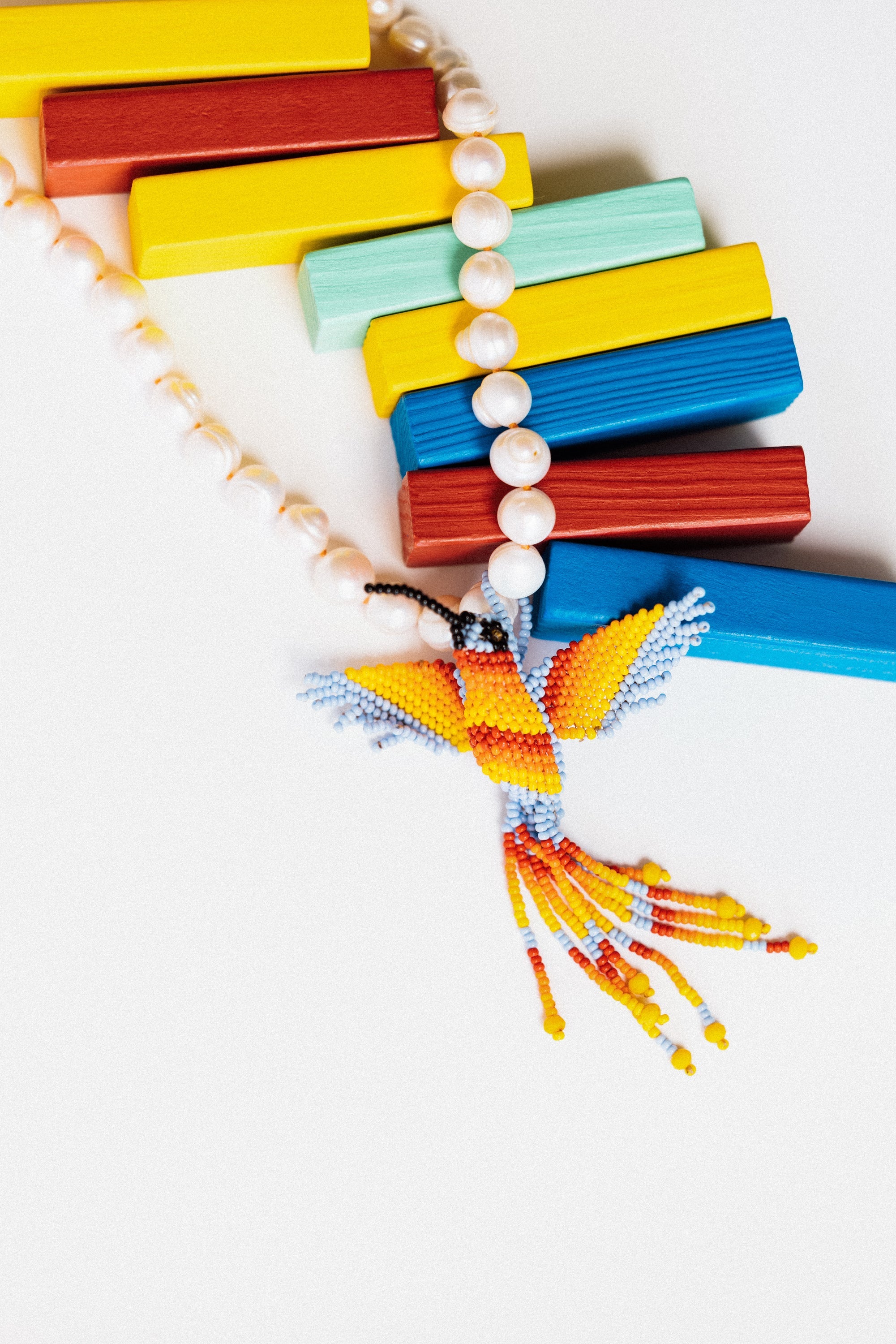 100% Natural Pearls + Hummingbird made of Acrylic Beads / Stainless Steel Clasp + 18k Gold Plating