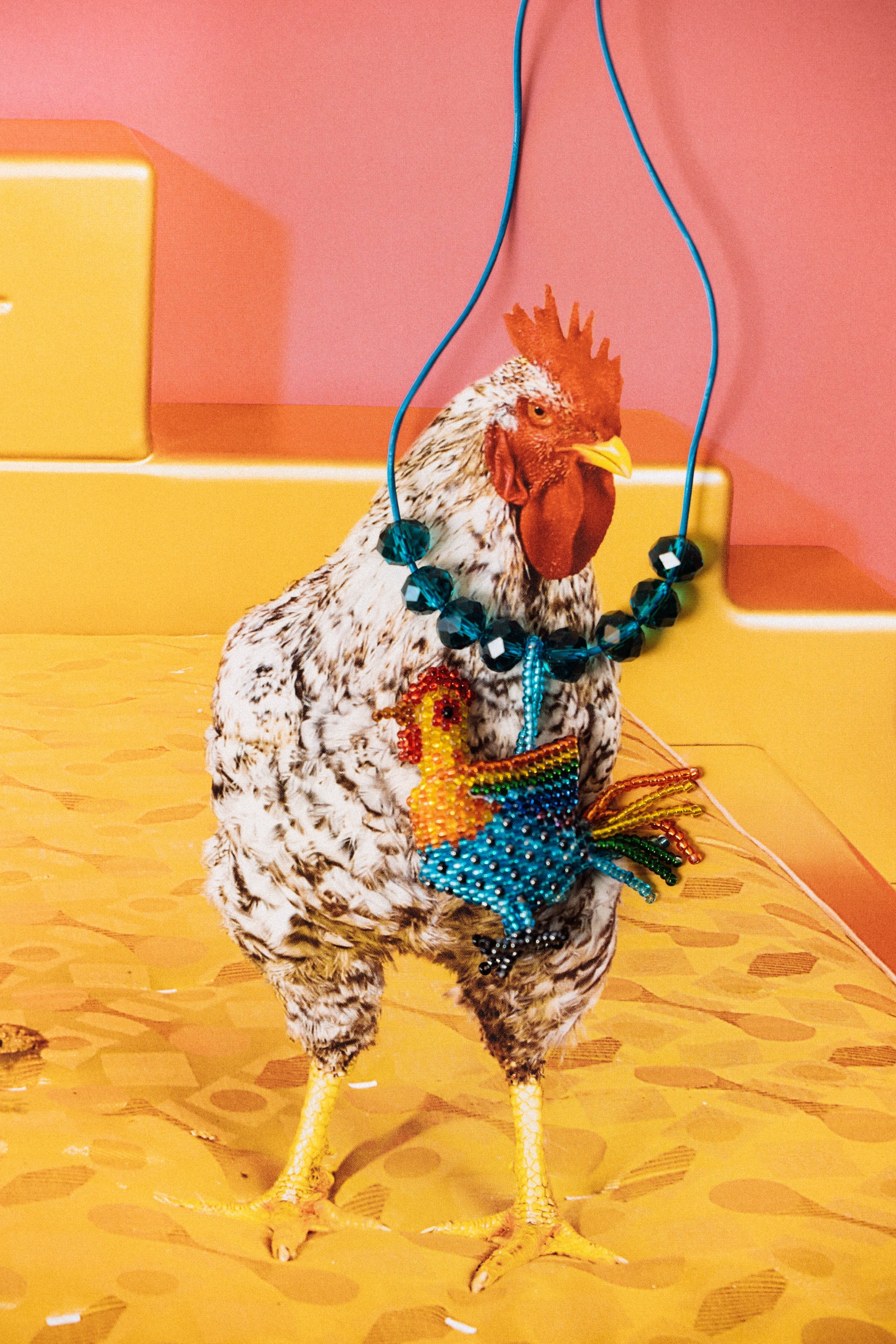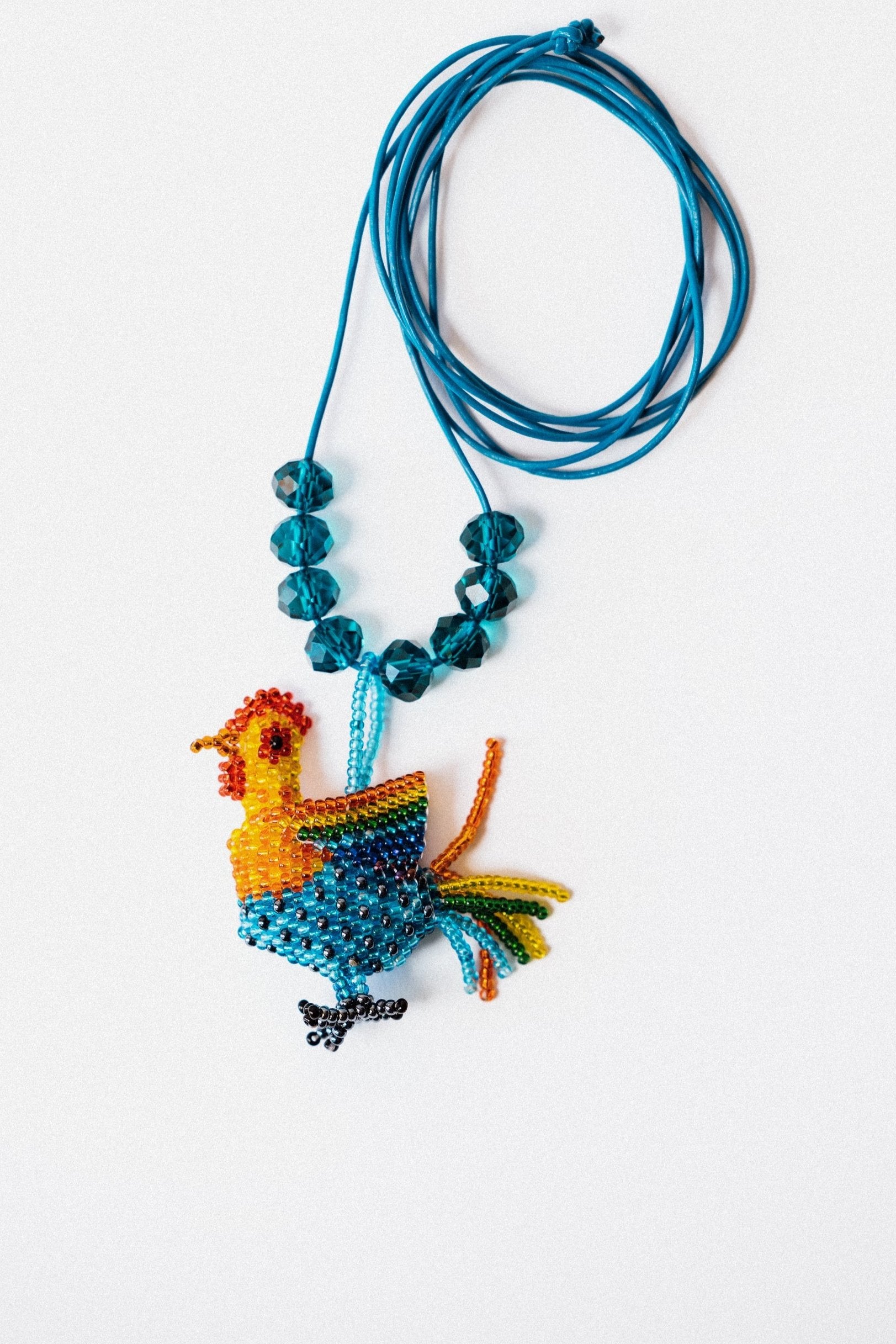 Blue Greek Leather + Rooster made of Acrylic Beads + Crystal Spheres