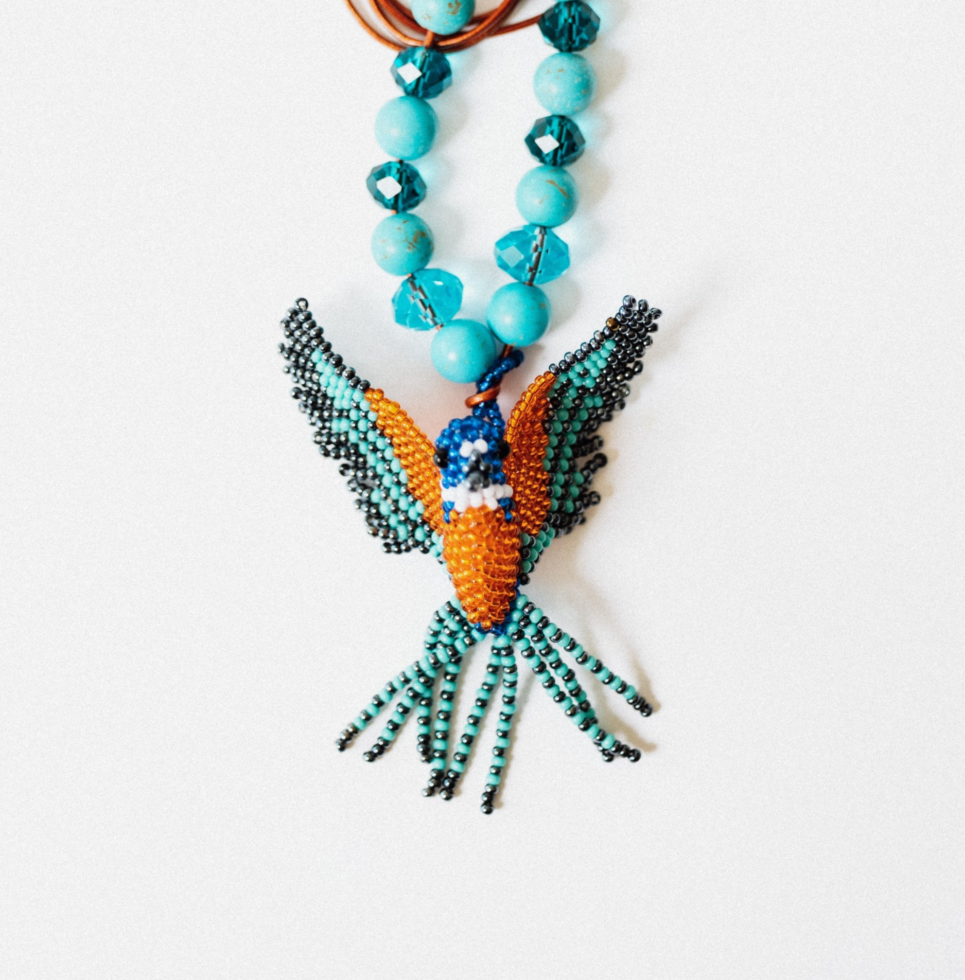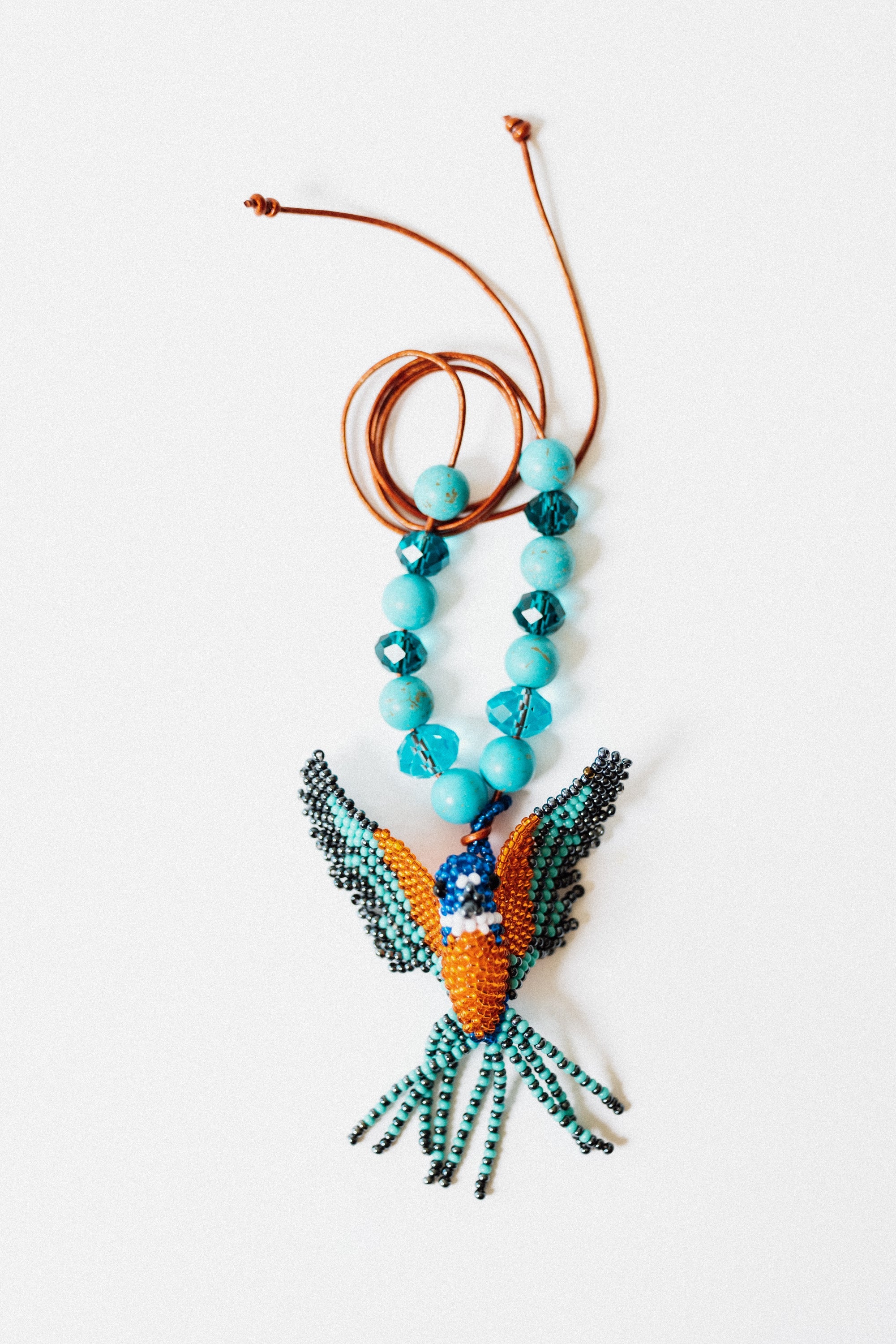 Metallic Brown Greek Leather + Bird made of Acrylic Beads + Crystal and Turquoise Spheres