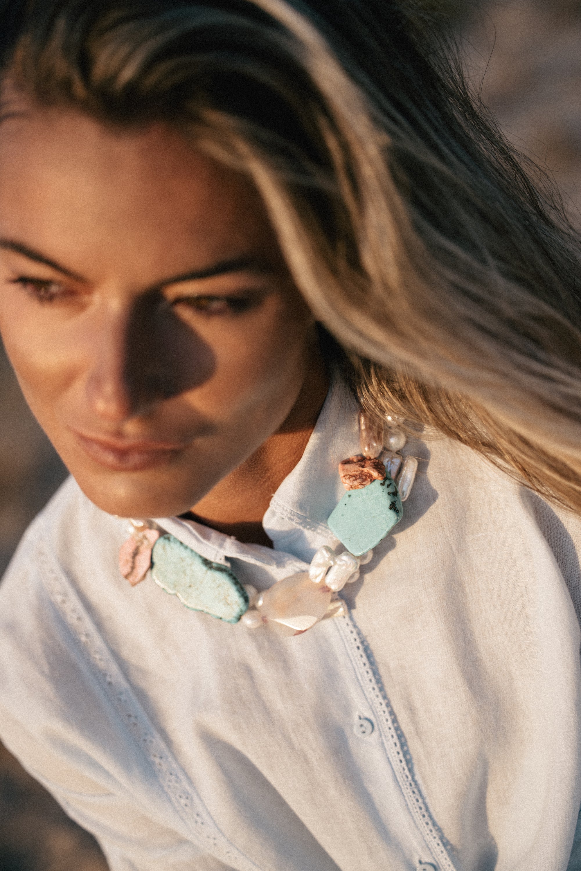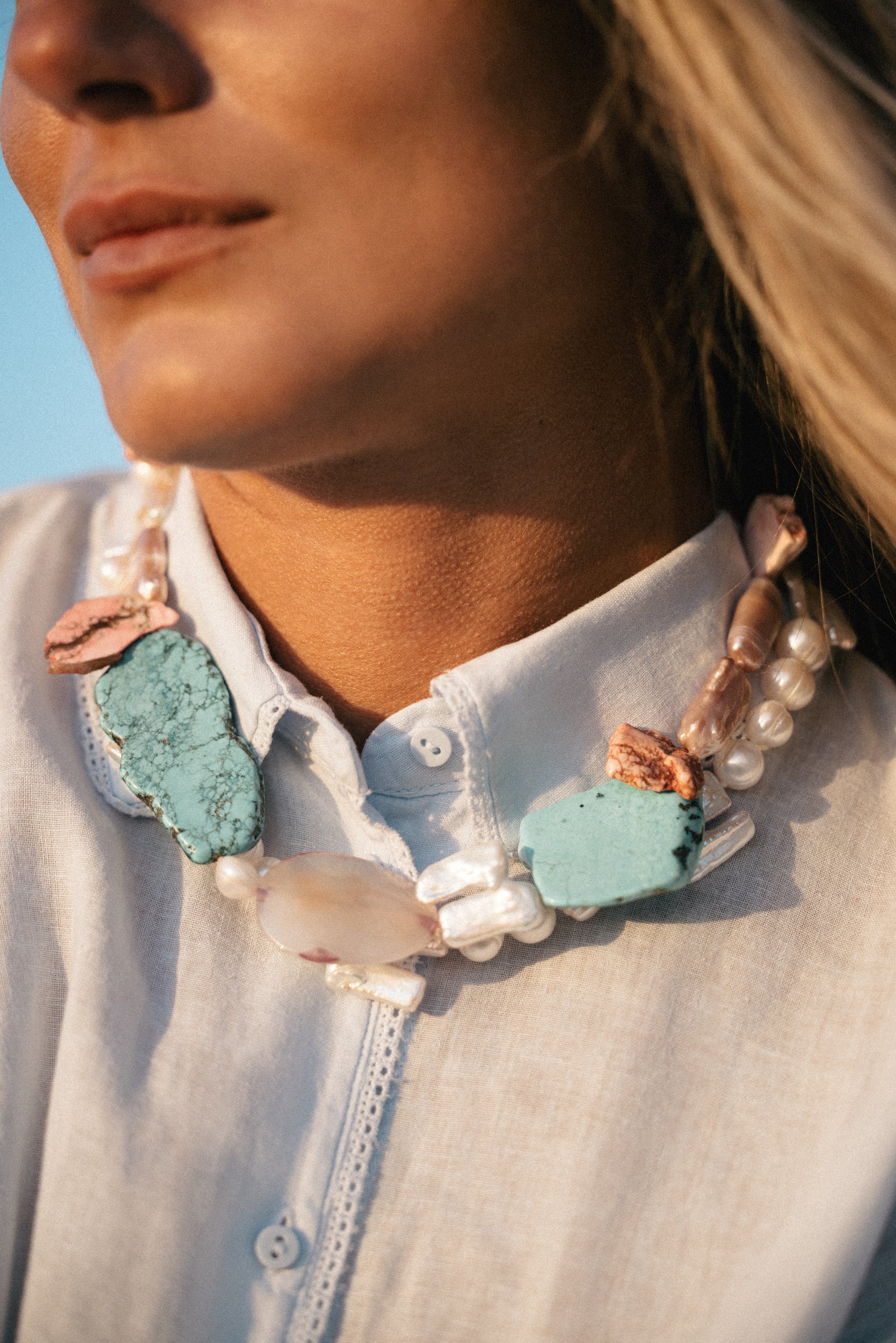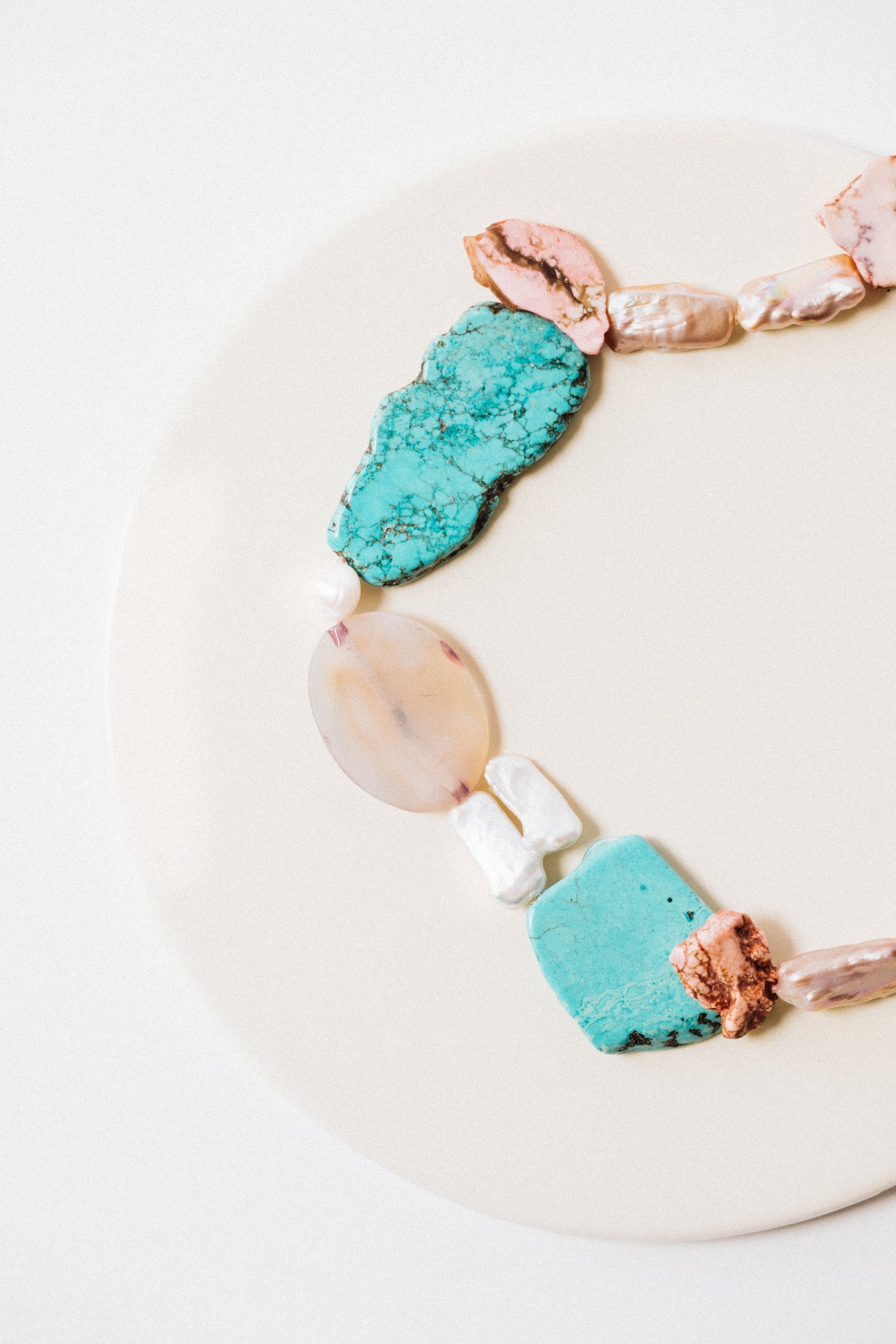 Natural Turquoise, Amethyst, Pearl, Mother of Pearl, Fluorite, and Rhodochrosite Stones / Stainless Steel Clasp with 18k Gold Plating.