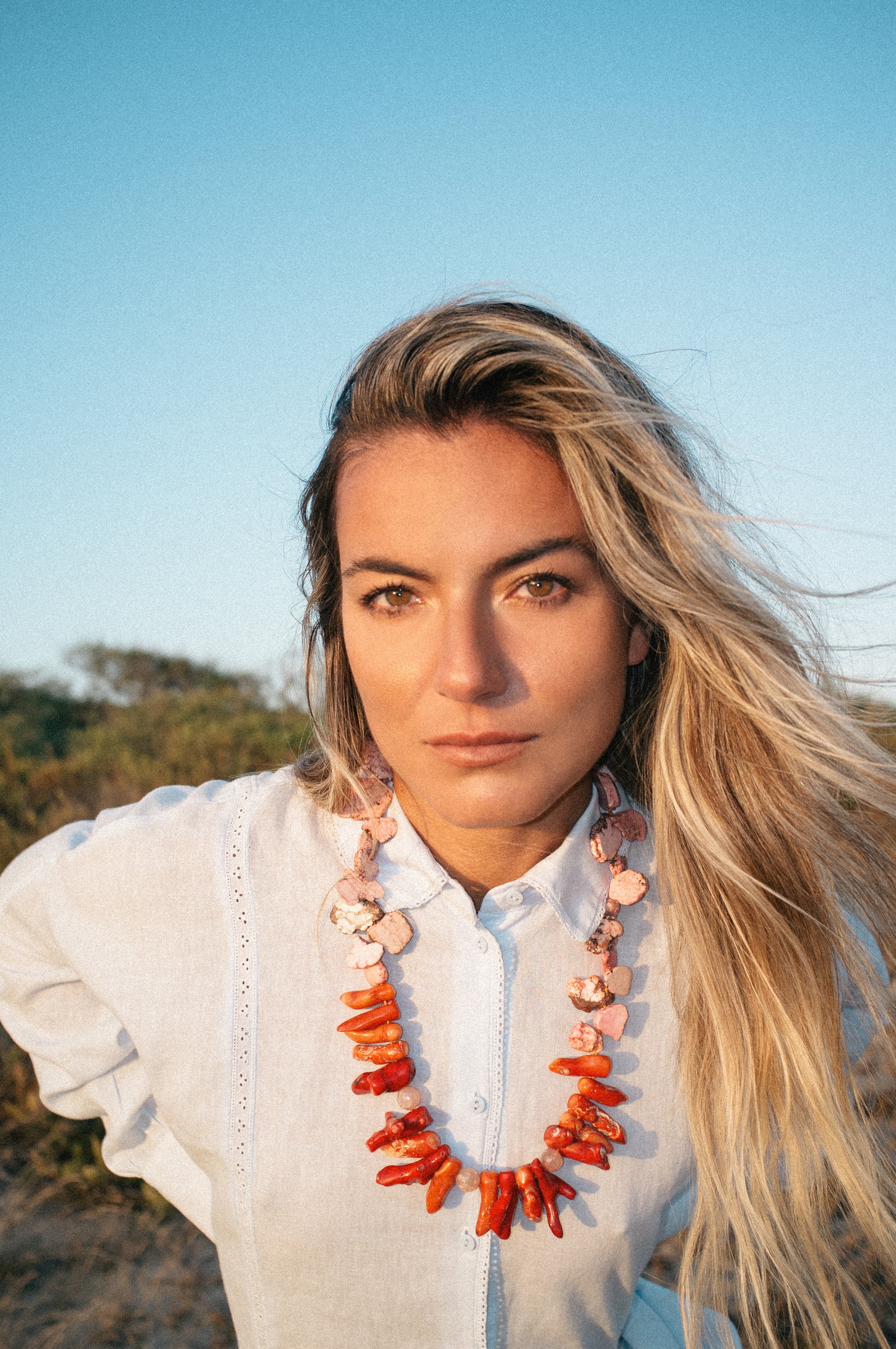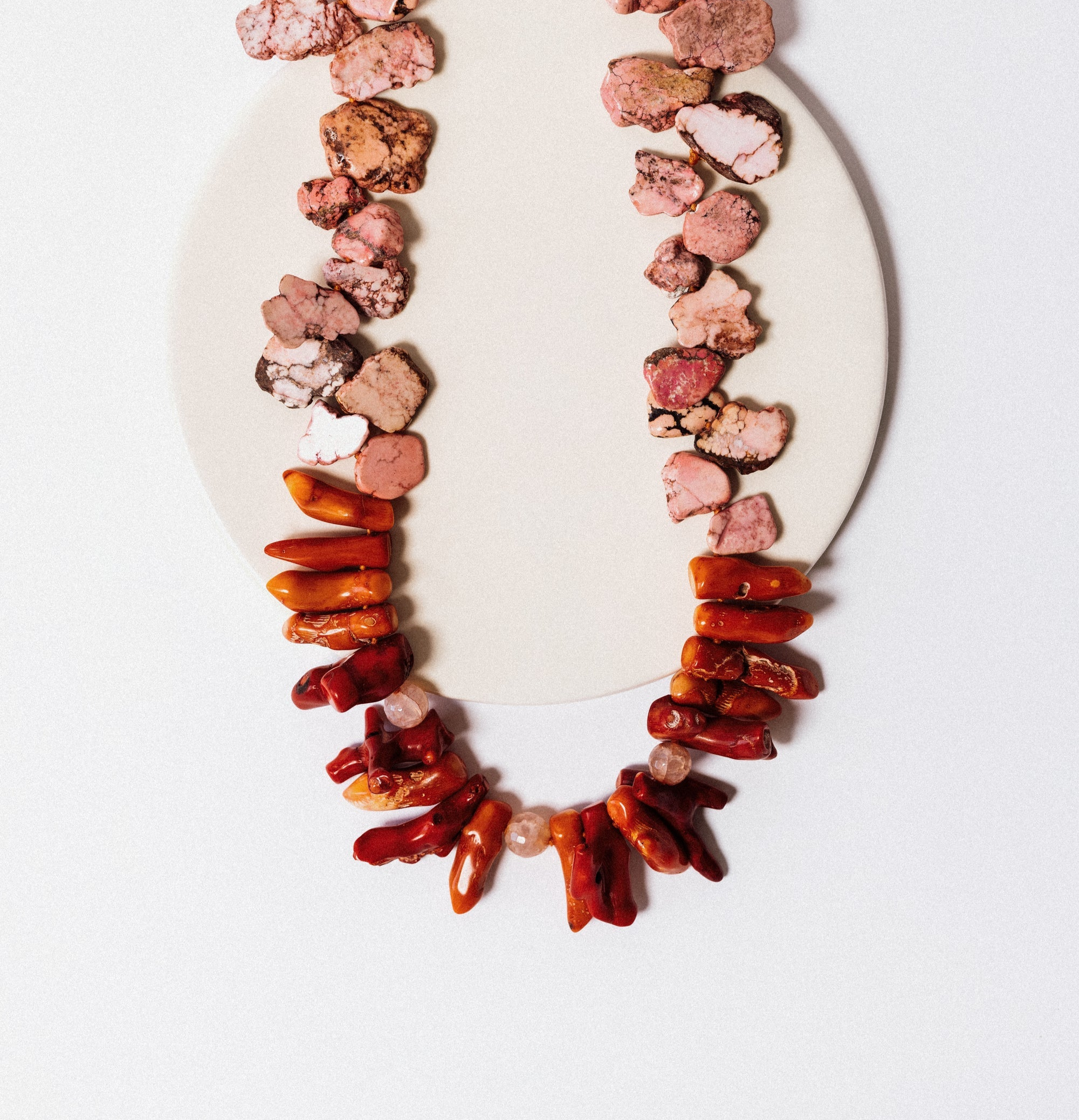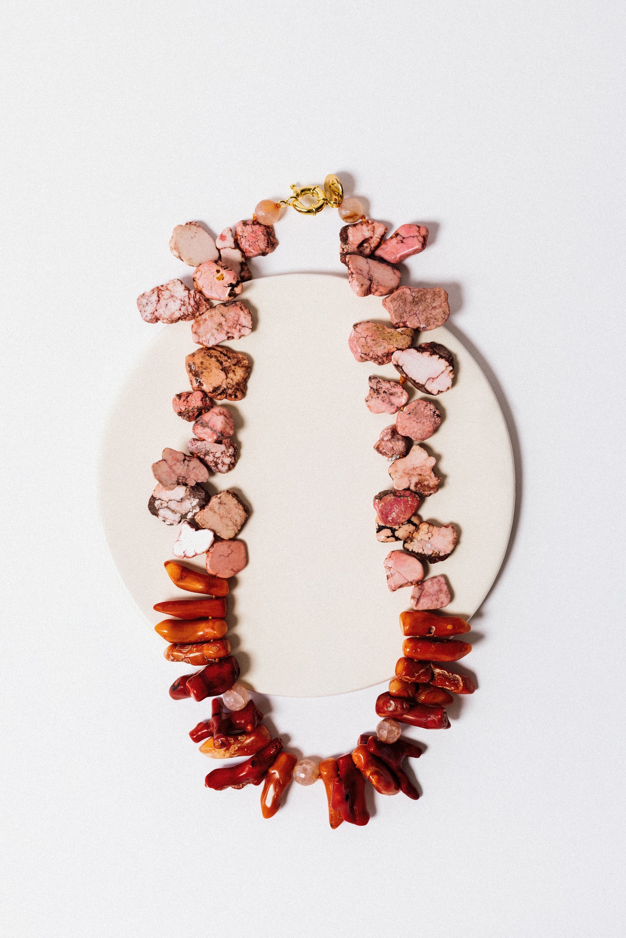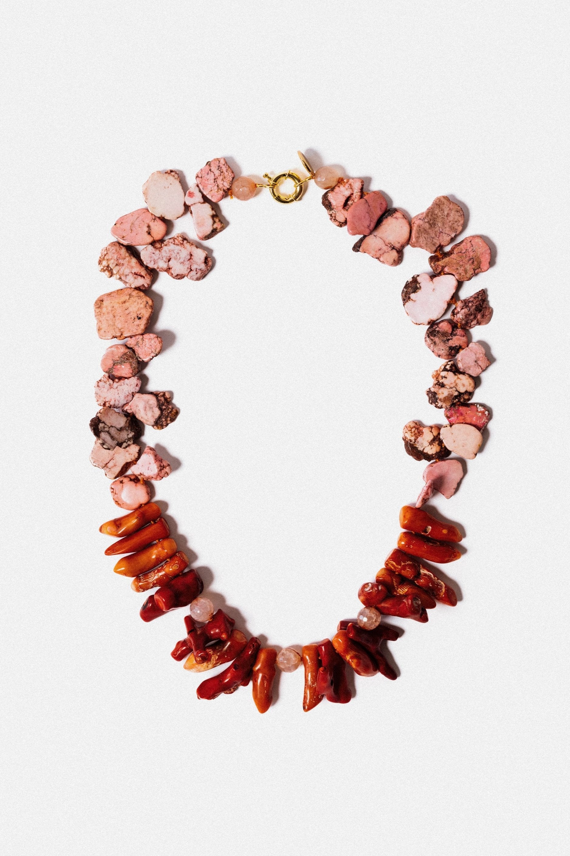 Natural Aragonite, Thulite, and Coral Stones / Stainless Steel Clasp with 18k Gold Plating.
