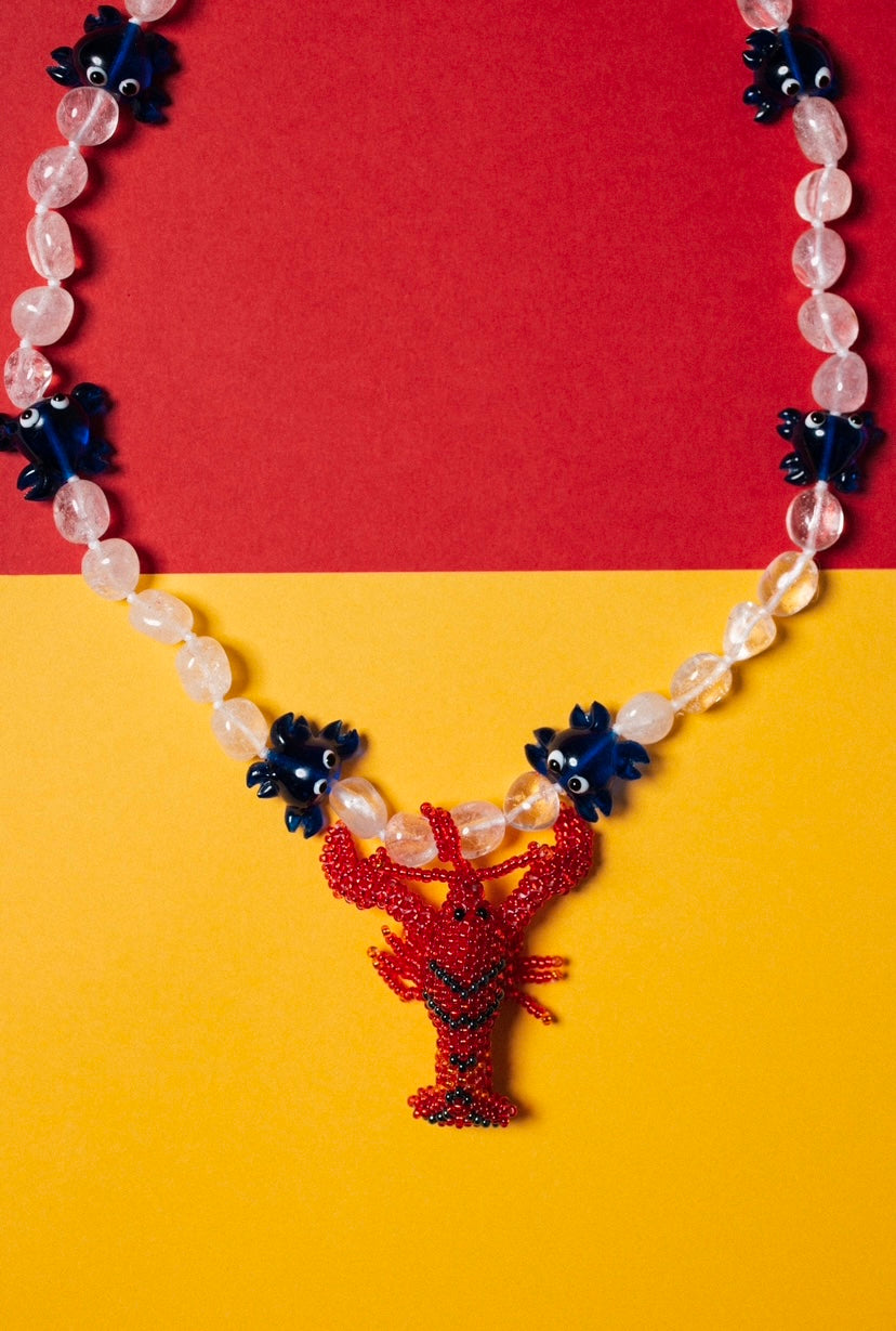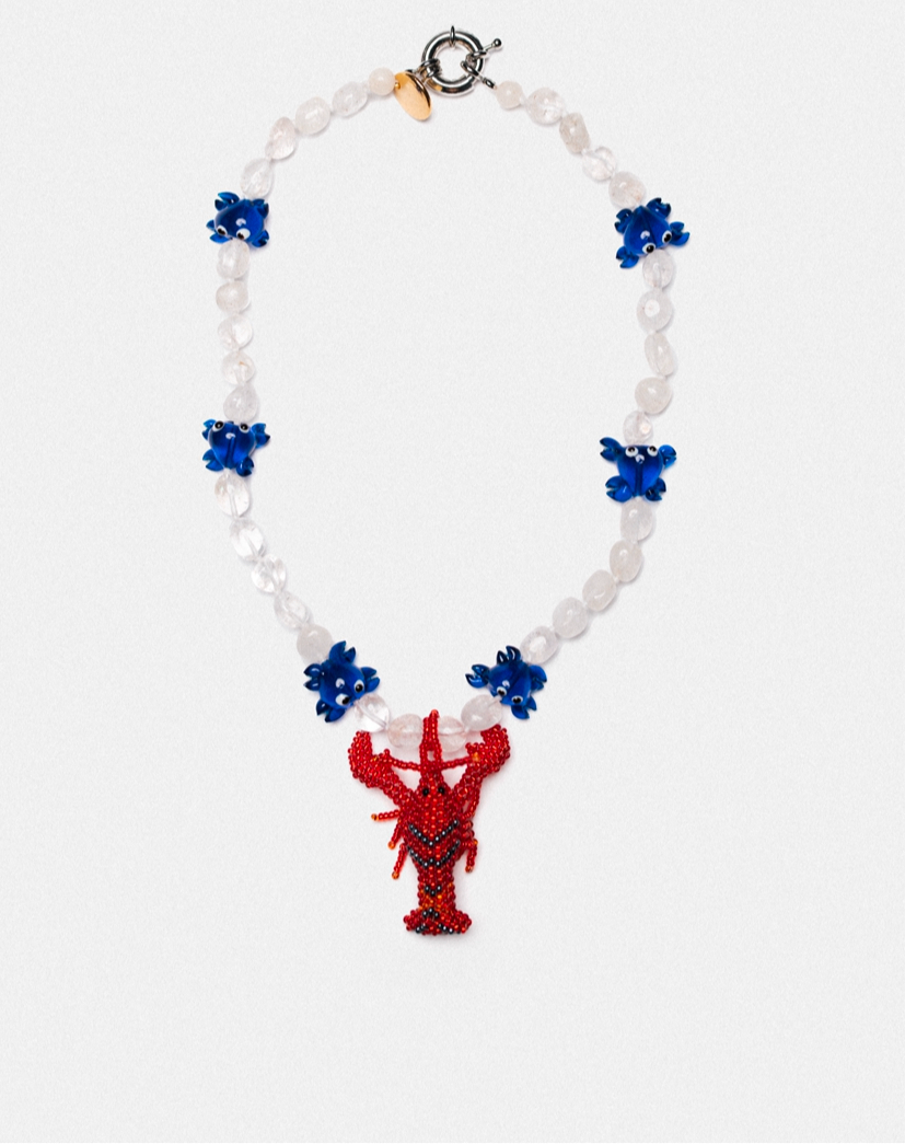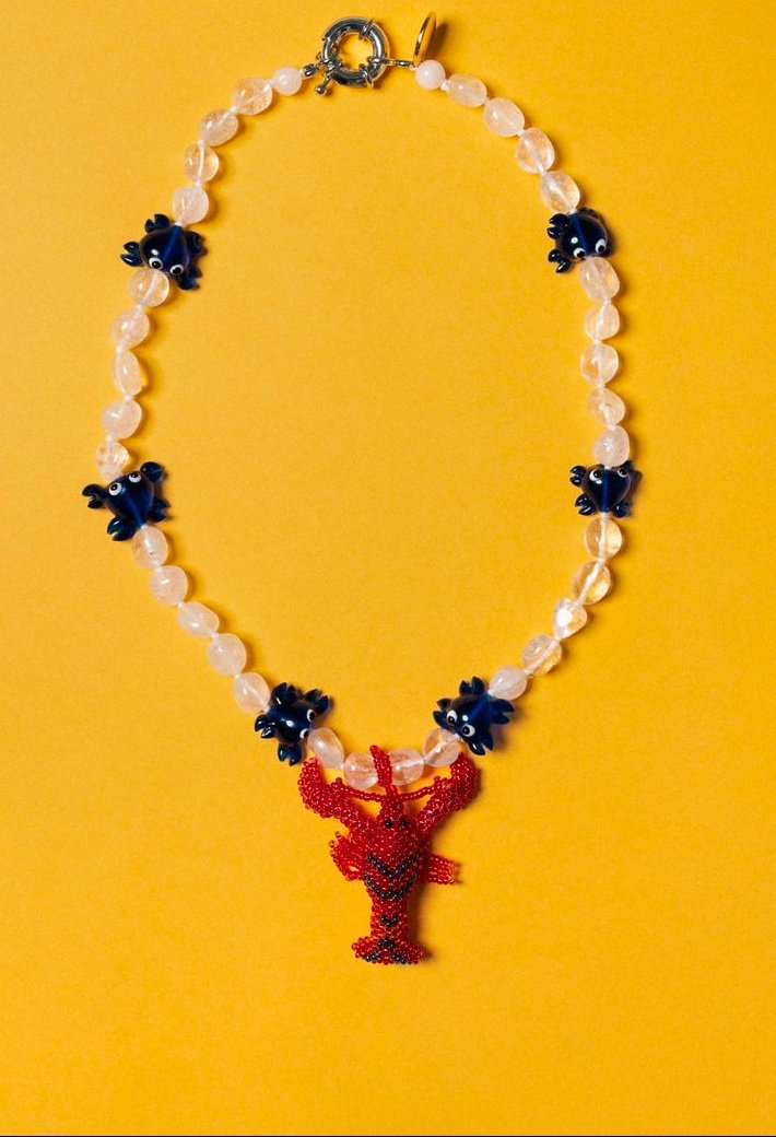 Acrylic Beads pendant Lobster + Natural Quartz Stones + Murano glass+ Stainless Steel Clasp with 18k Gold Plating