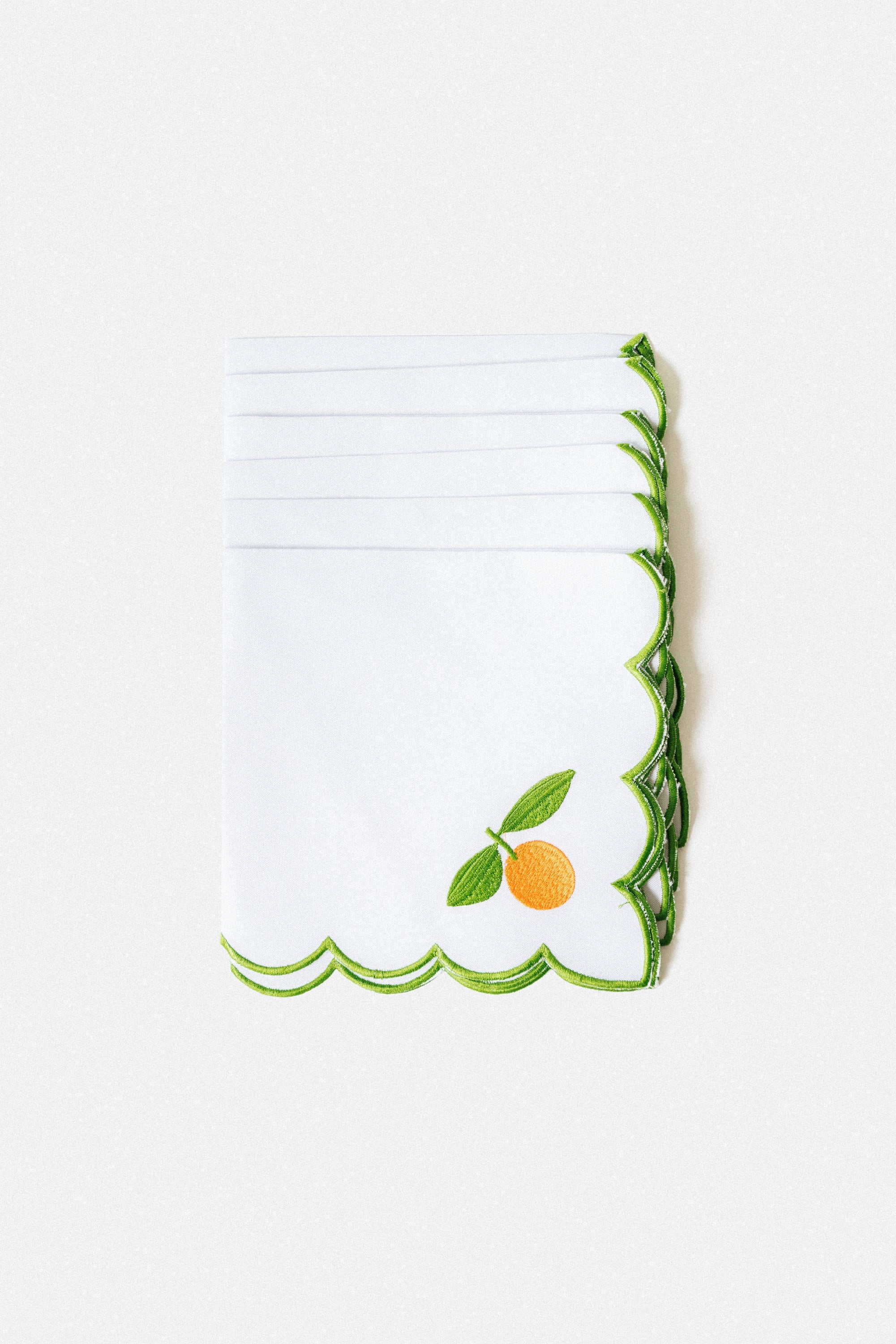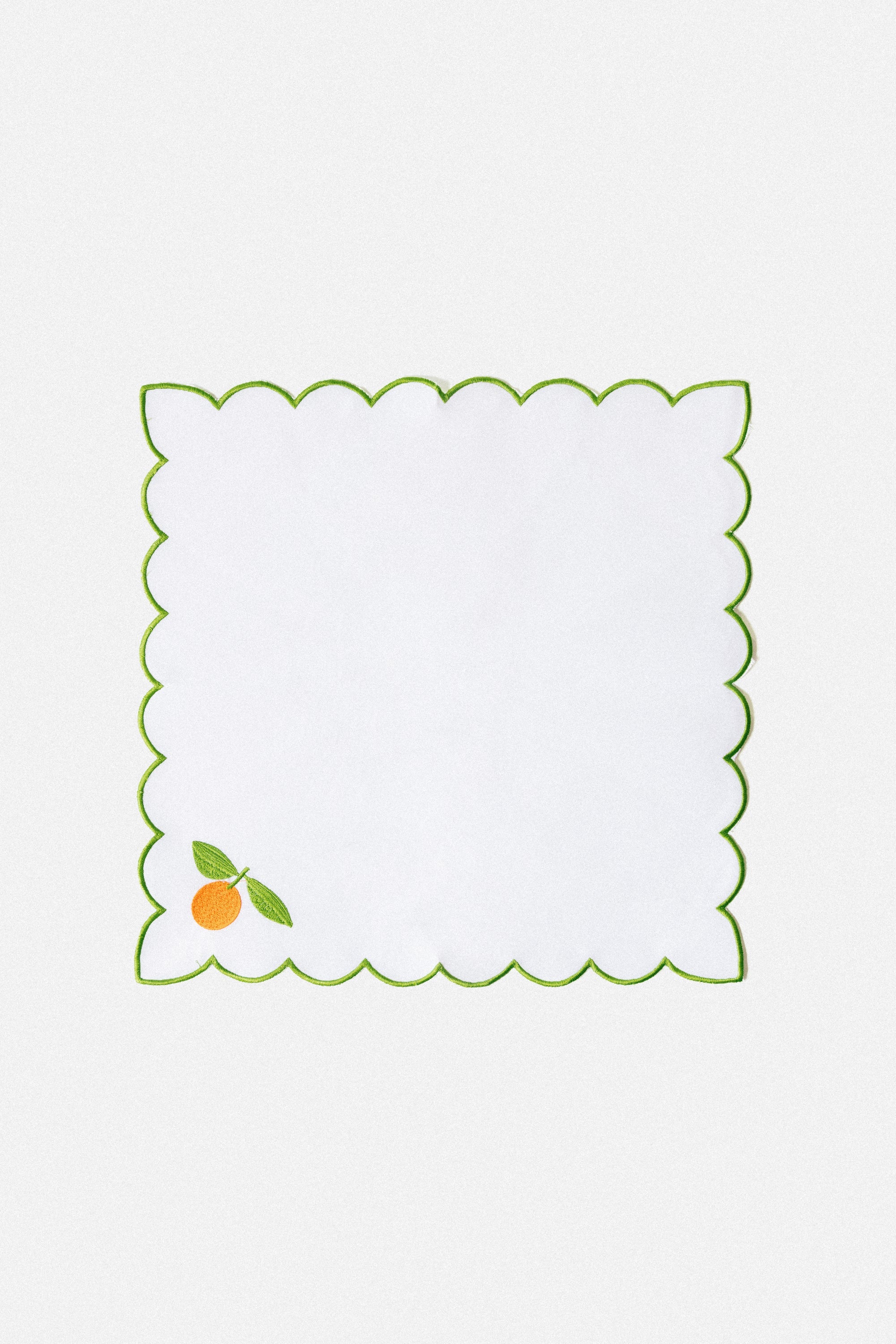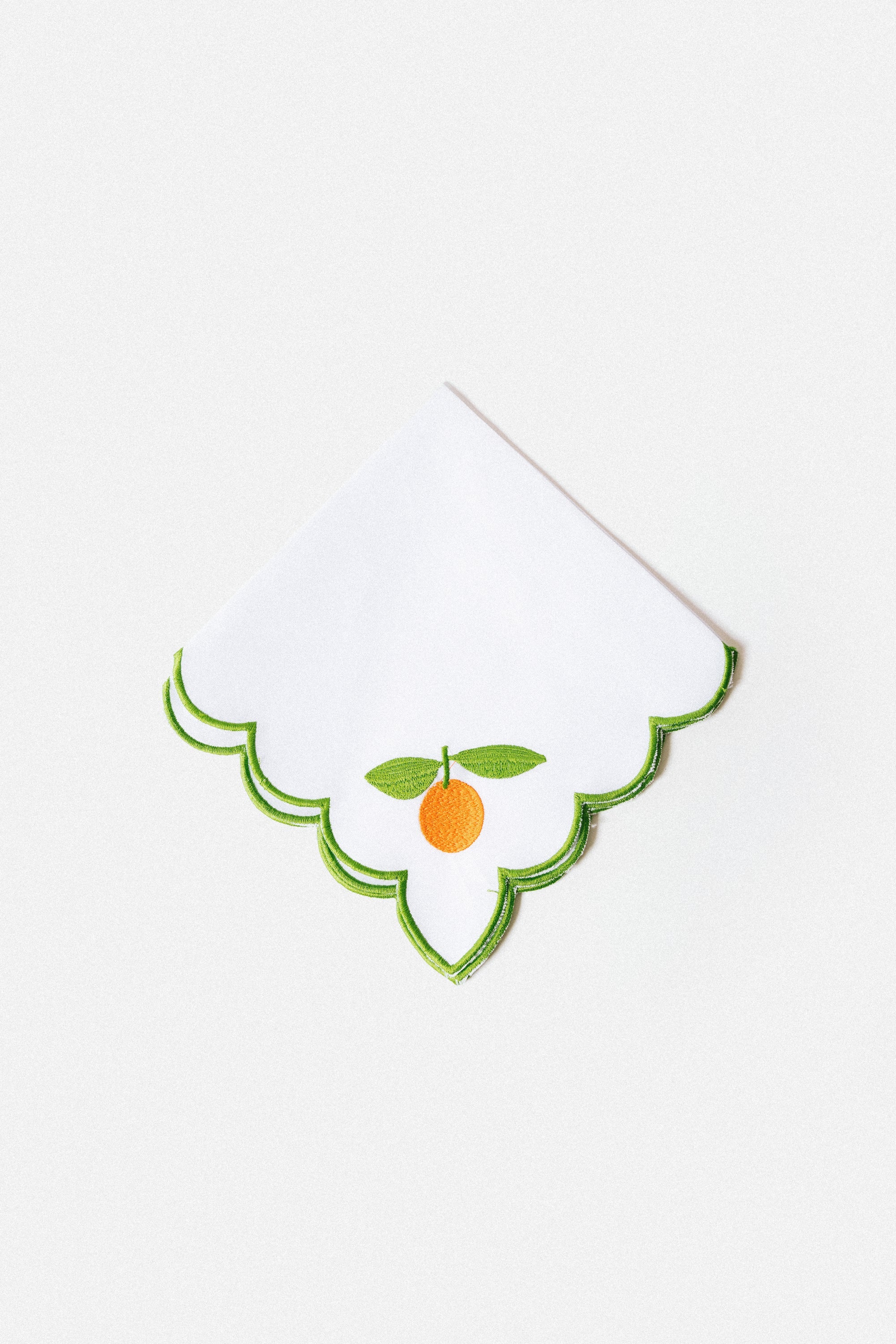 White cotton napkin with an orange embroidered in green and orange on one edge. Handmade with all our love in Portugal.