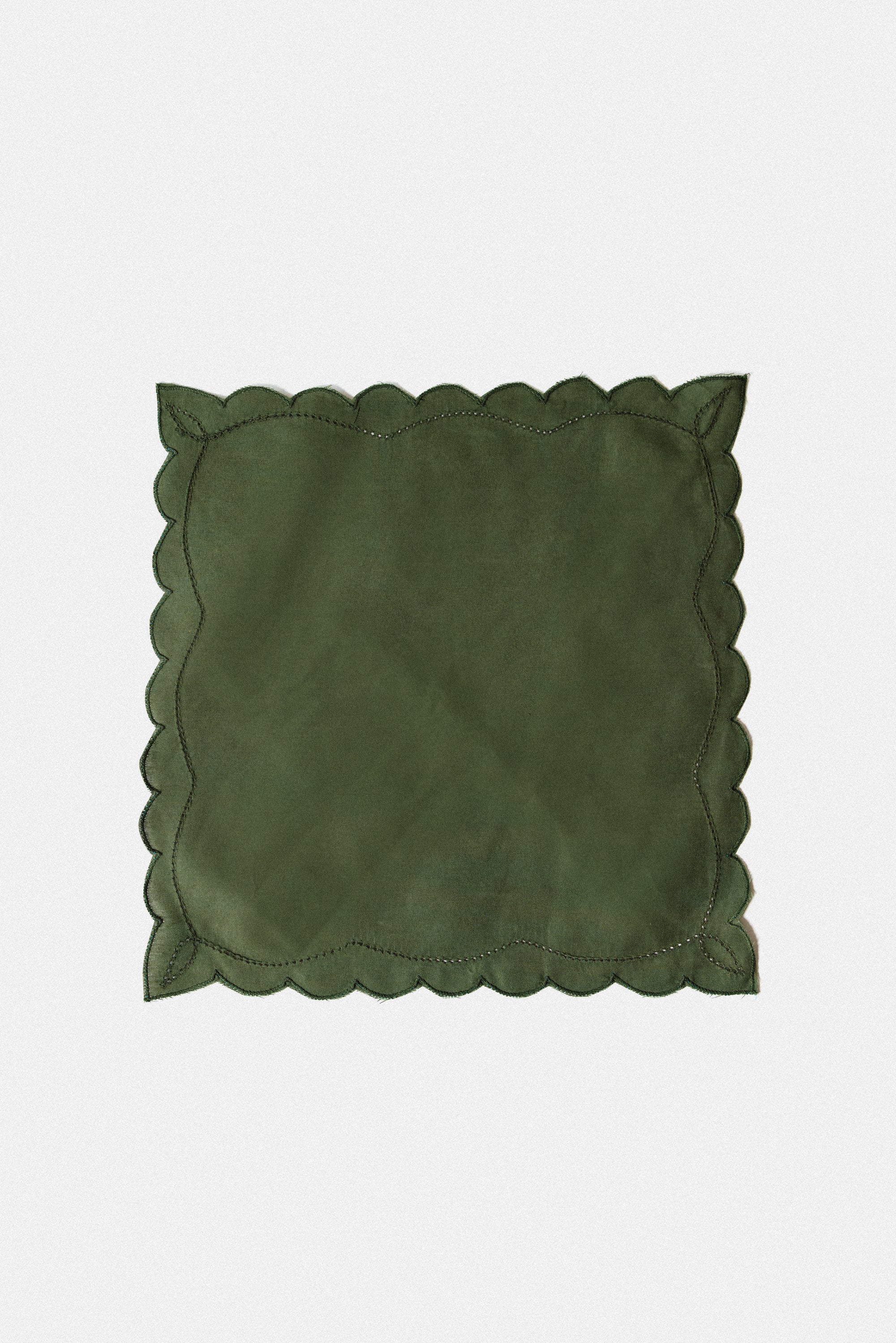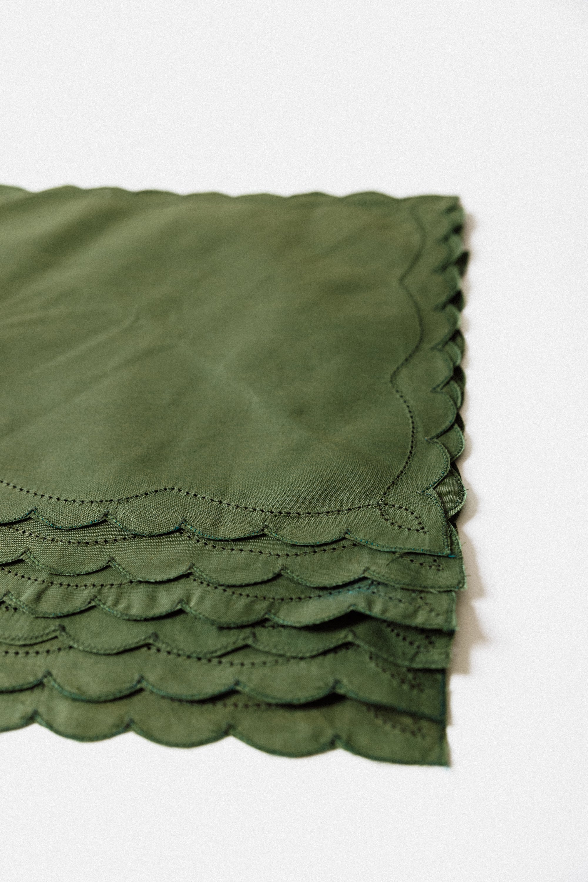 Green cotton napkins with green stitching. The stitching is featured throughout the napkin. Handmade with all our love in Portugal.