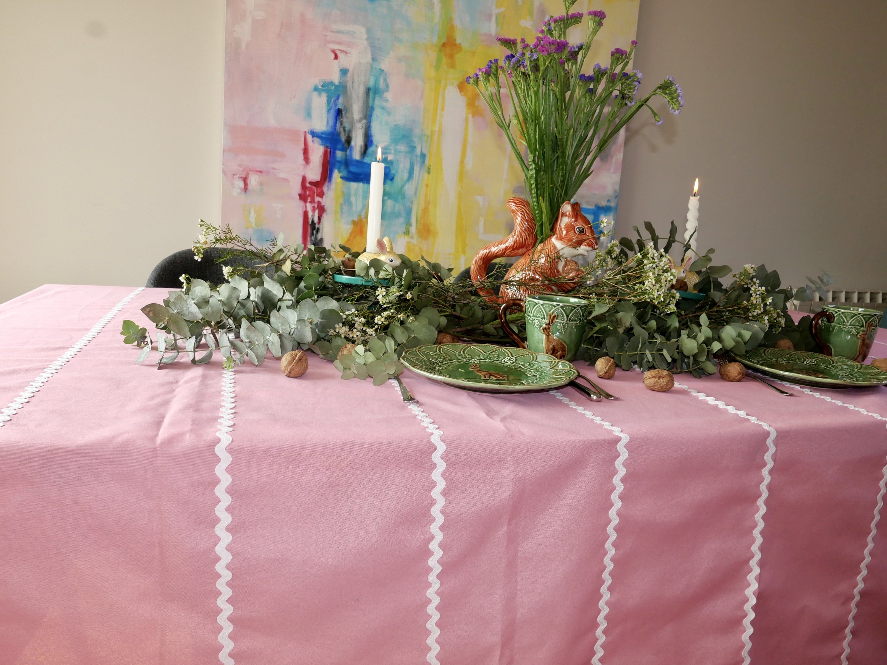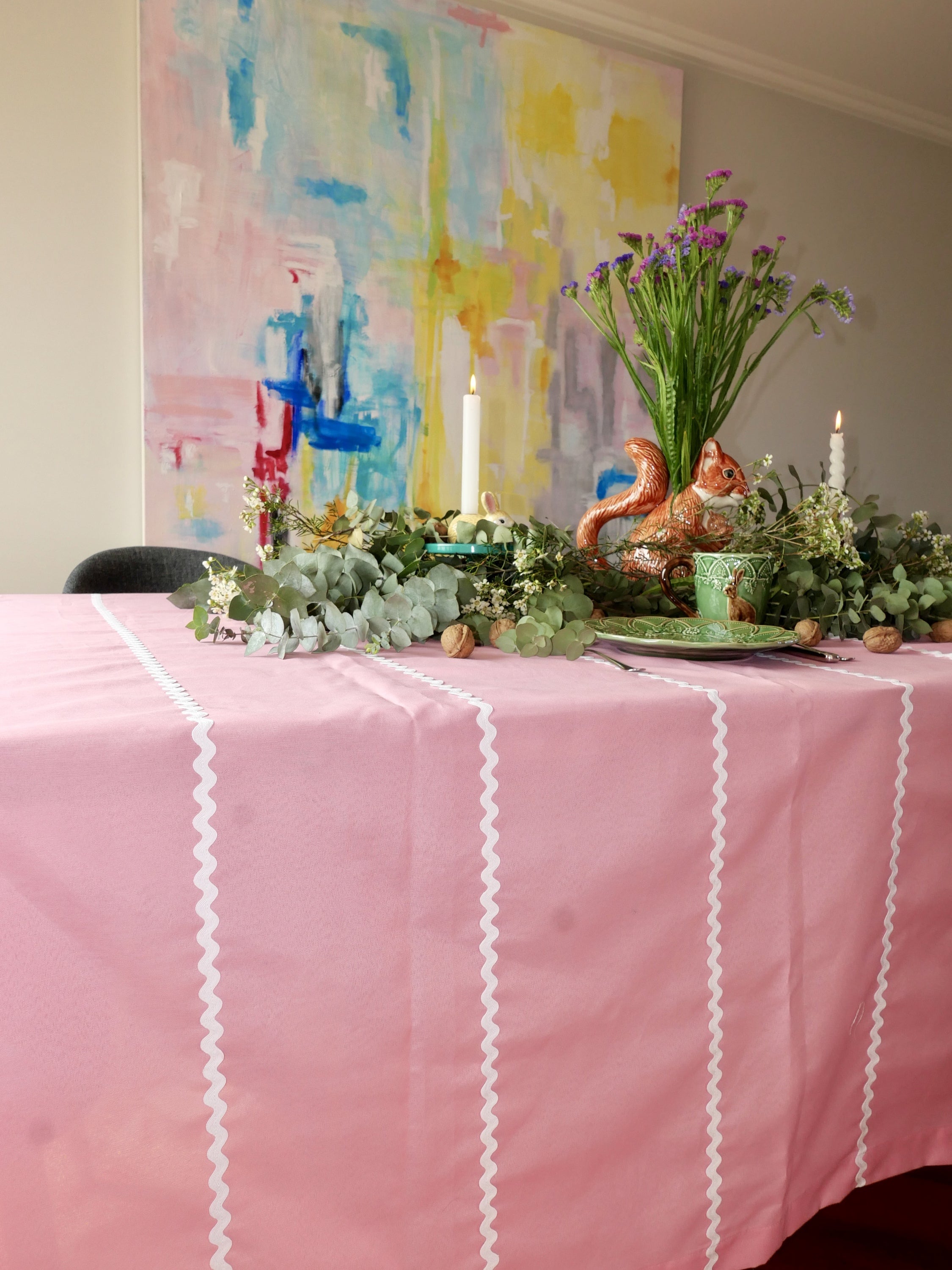 Rectangular cotton tablecloth with white stripes on a pink background. Handmade with all our love in Portugal.
