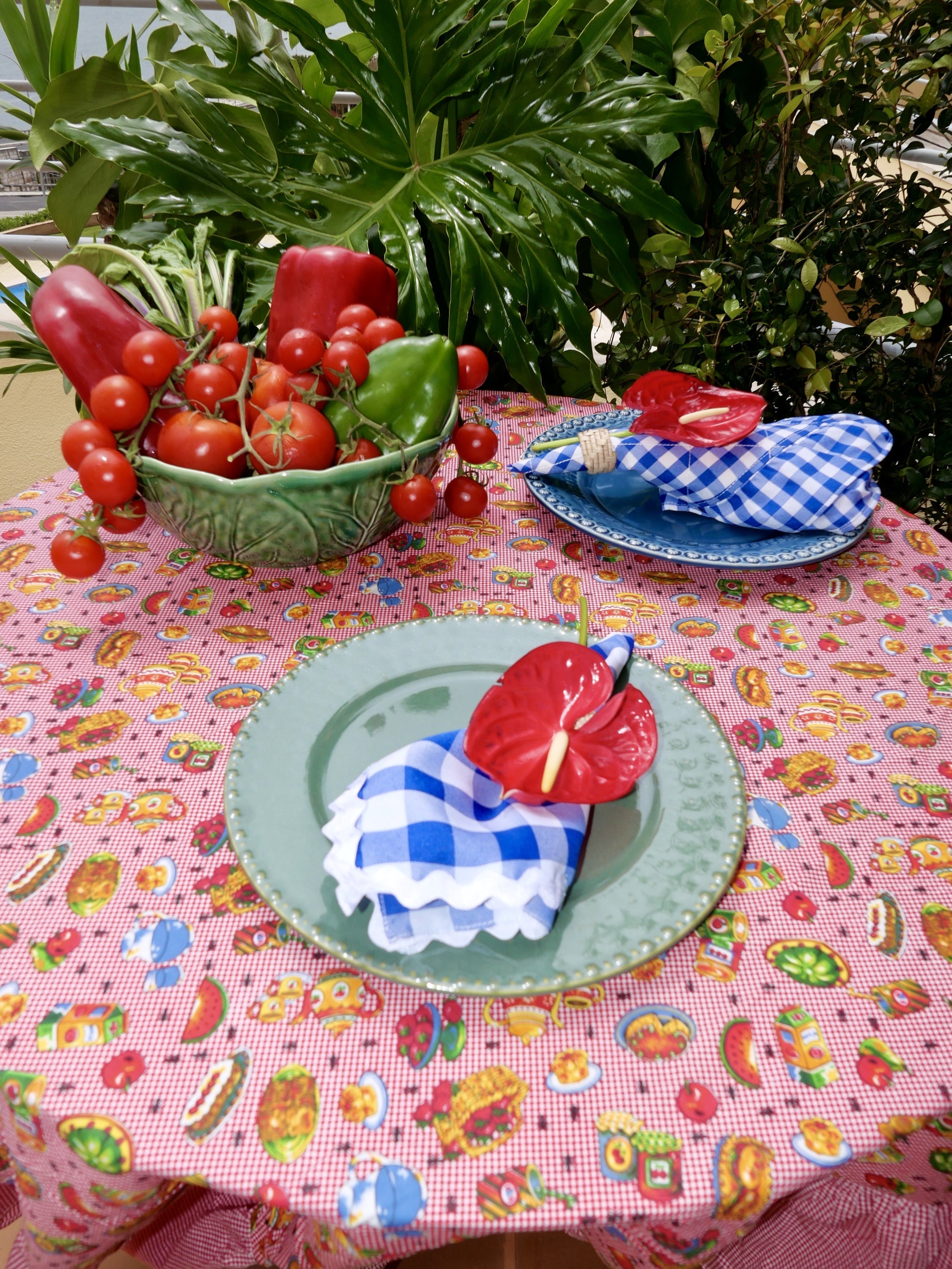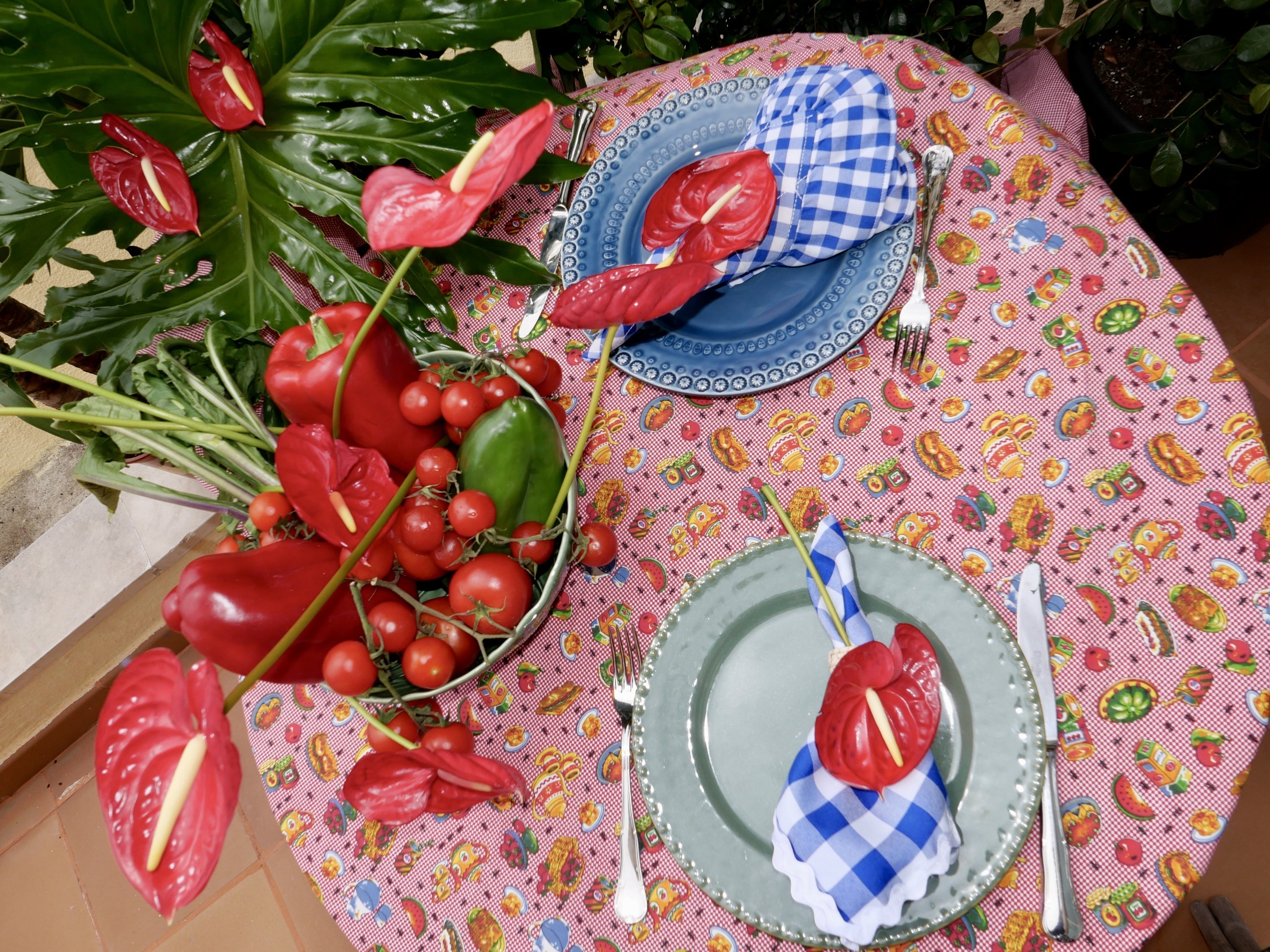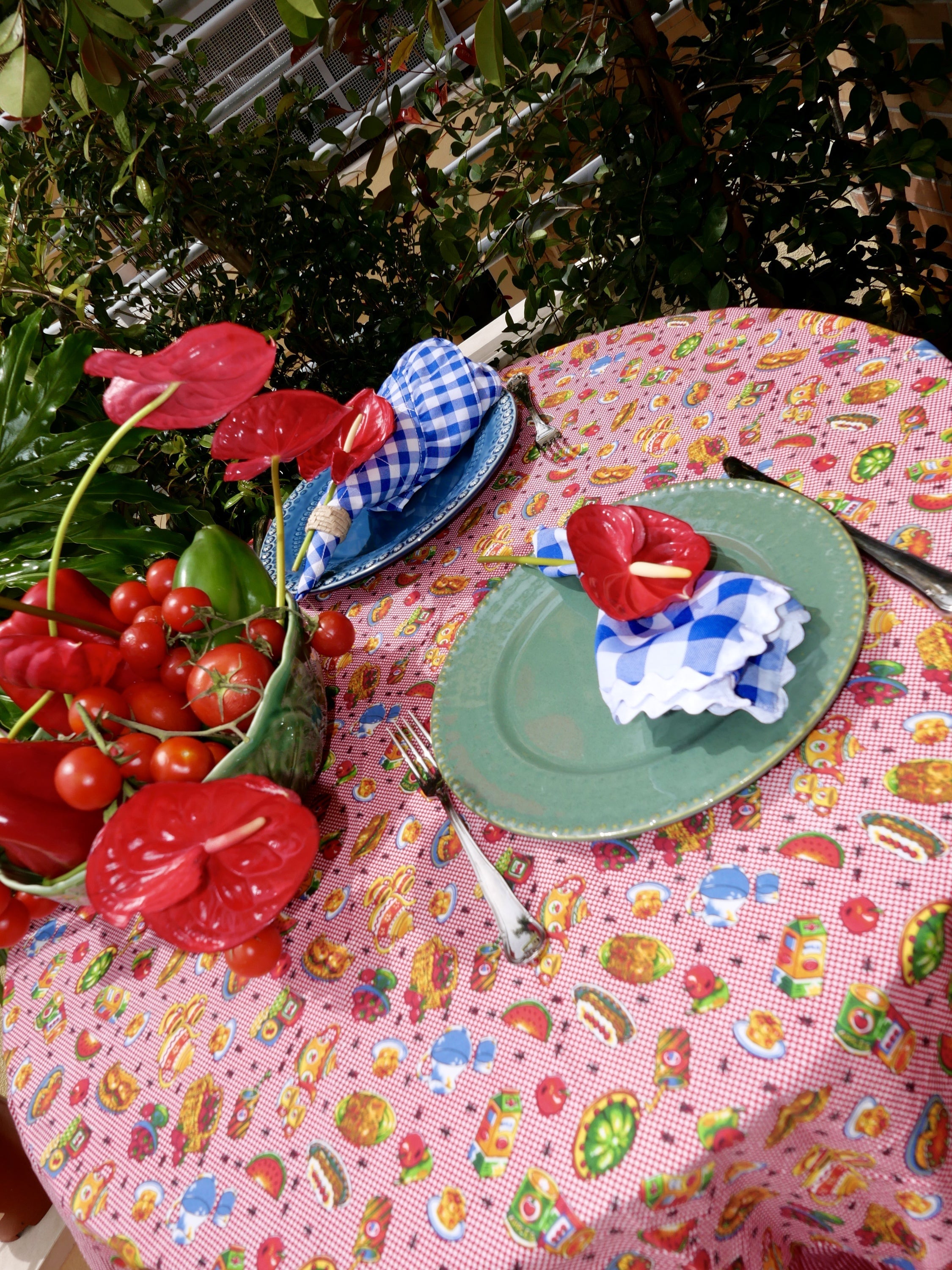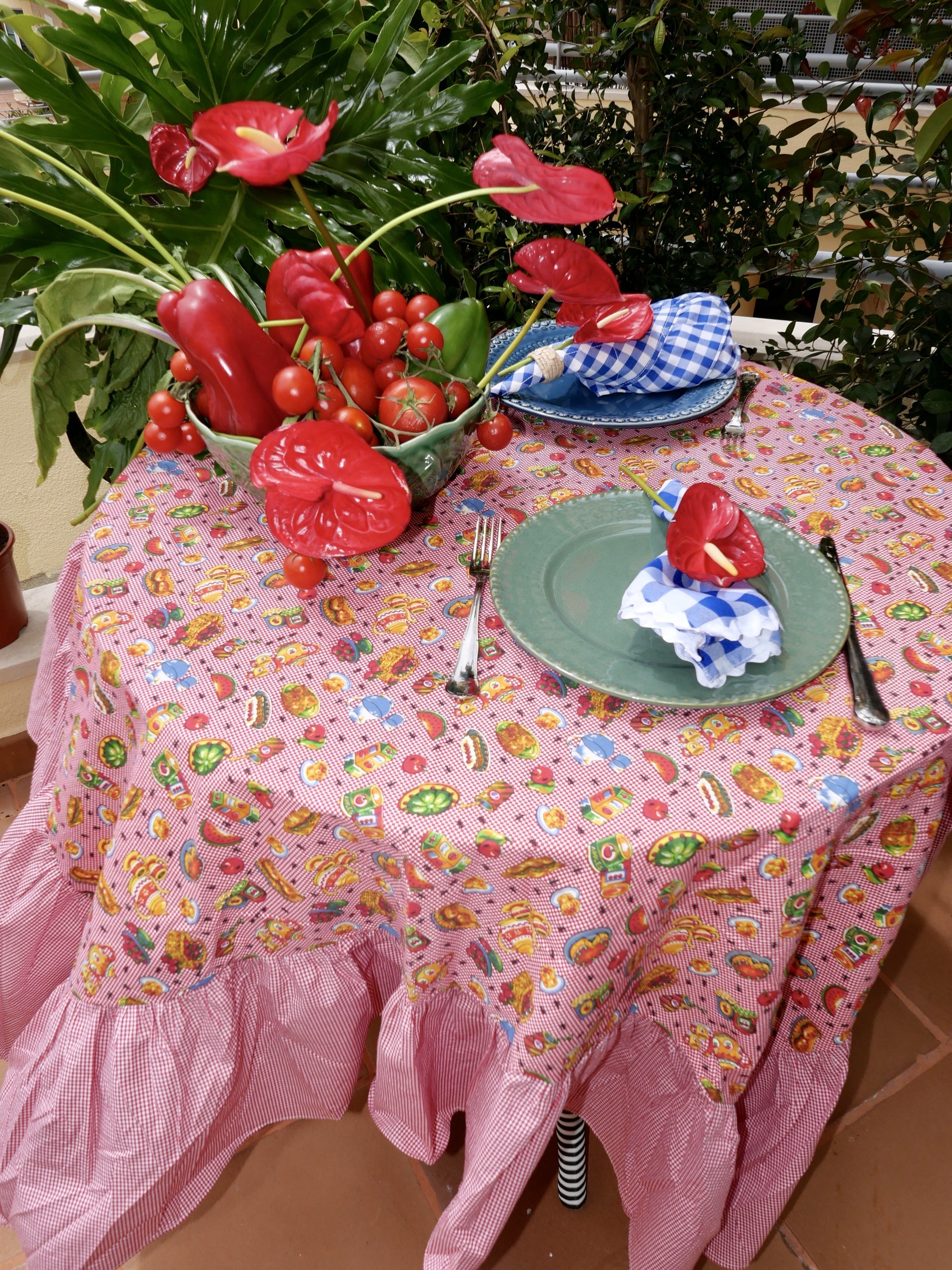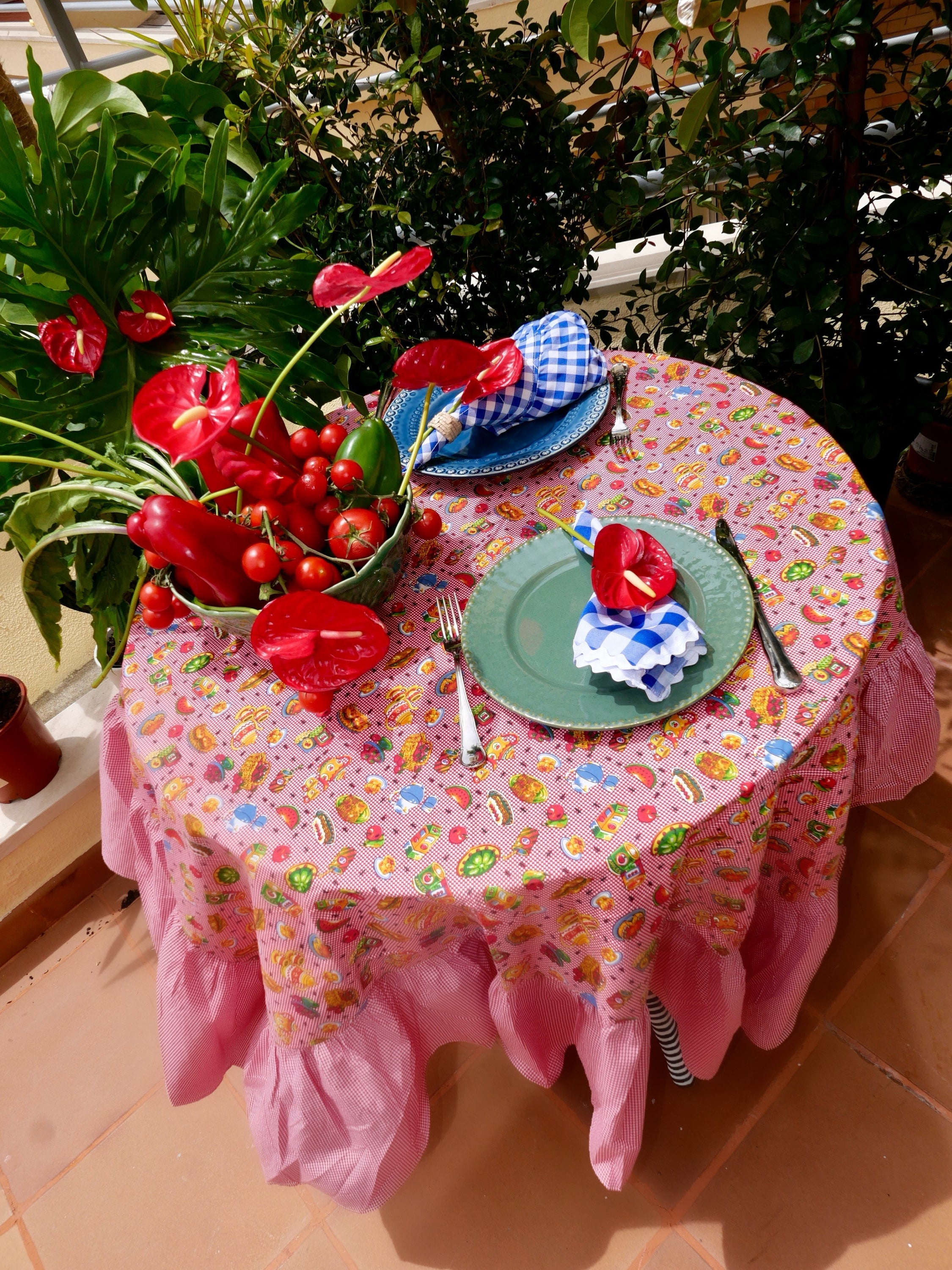 Round cotton tablecloth with ruffles around the edge. Handmade with all our love in Portugal.