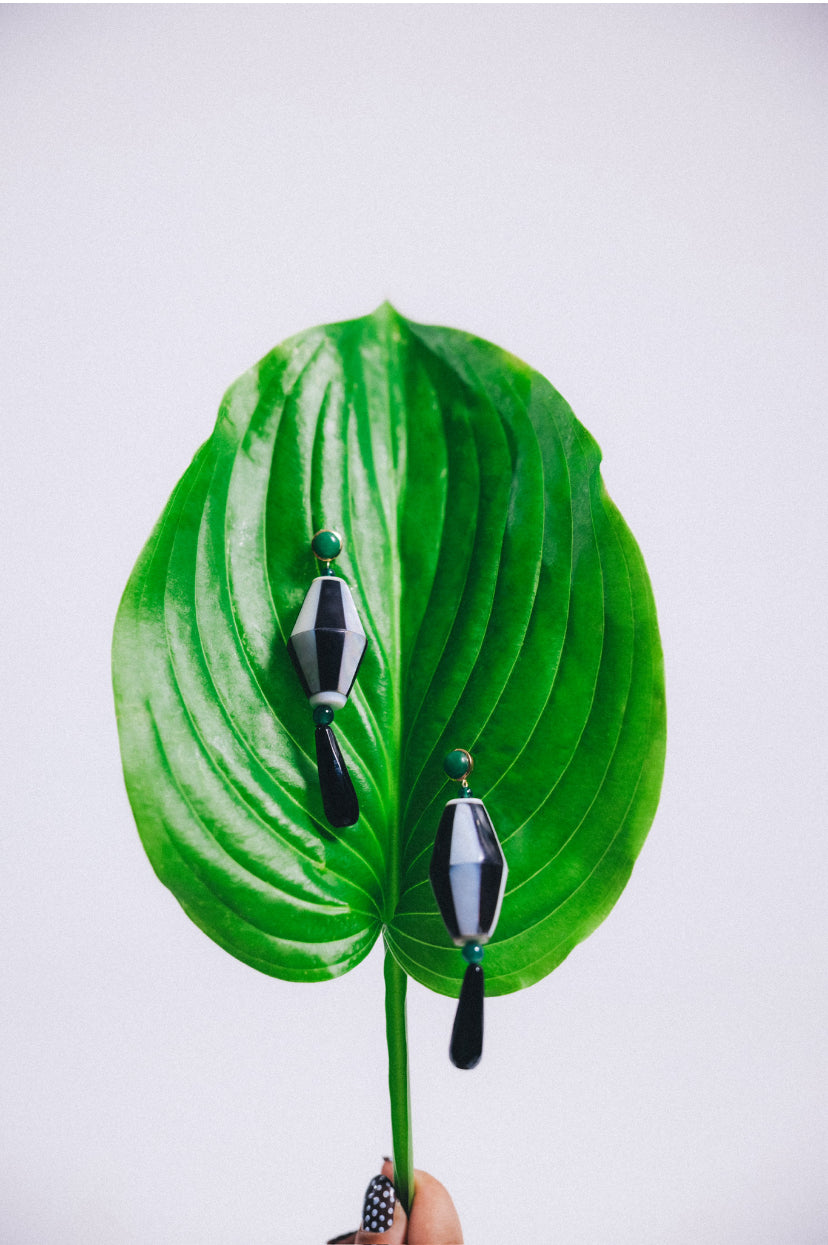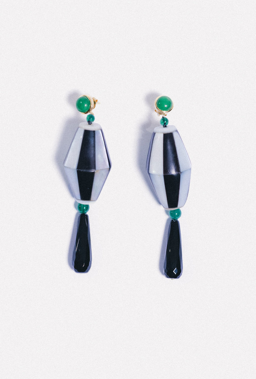 Black and white cylinders crafted from mother-of-pearl + Earring bases in 18k gold-plated+Natural Ónix stones