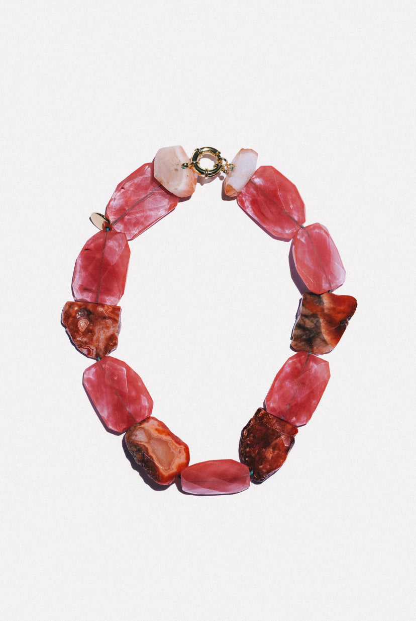 As pedras de Ágata Natural e Botswana, com formas orgânicas, são cuidadosamente trabalhadas na nossa oficina, o que as torna peças exclusivas. Cada uma representa um fragmento desta aventura mágica, incorporando a emoção, o desejo e a beleza que se encontram na natureza.Os detalhes em metal banhado a ouro, como fechos e etiquetas, fazem parte da nossa linha de joias premium. São garantidos por um revestimento de sete camadas de ouro 18k .