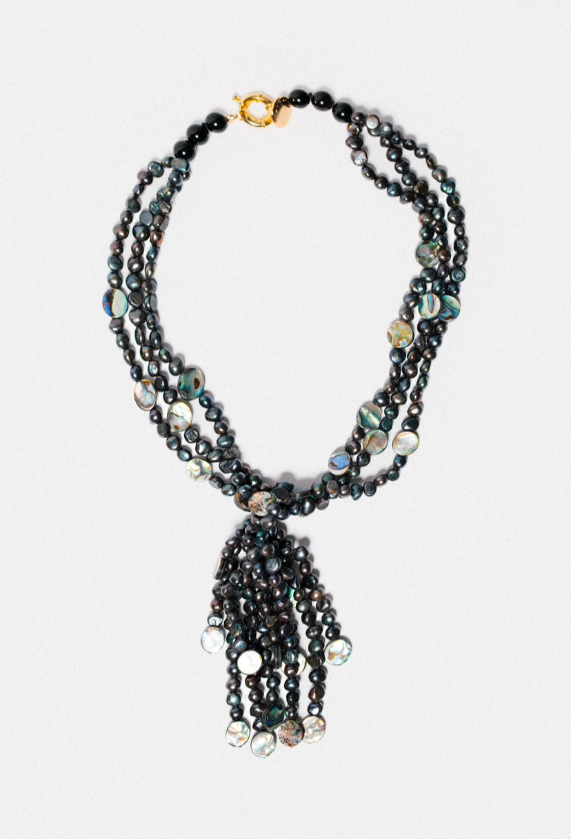 Pérolas Negras e Espinélios + Fecho em Aço com Banho de Ouro 18k