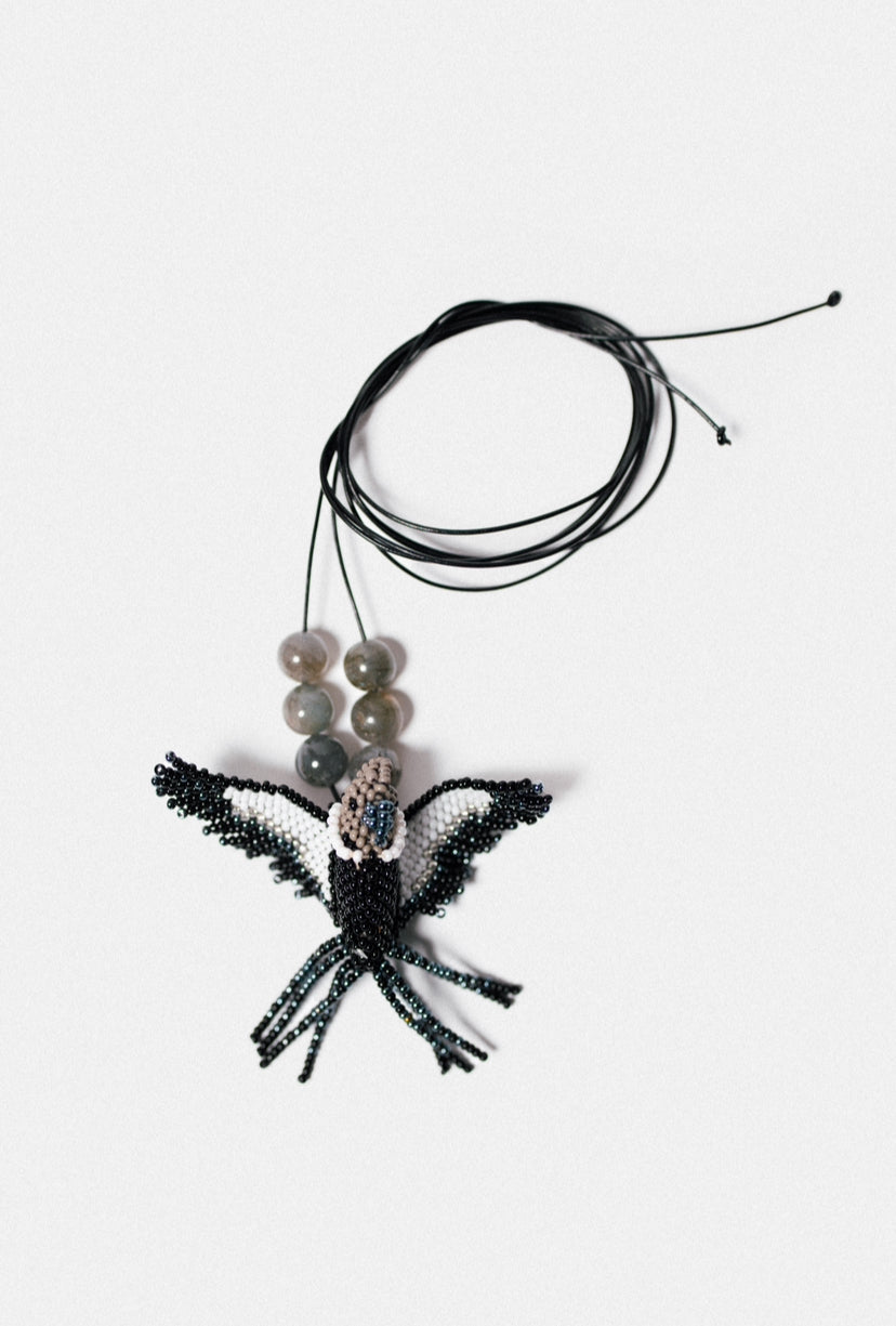 Black Greek Leather + Bird made of Acrylic Beads + Natural Opalinae Stones