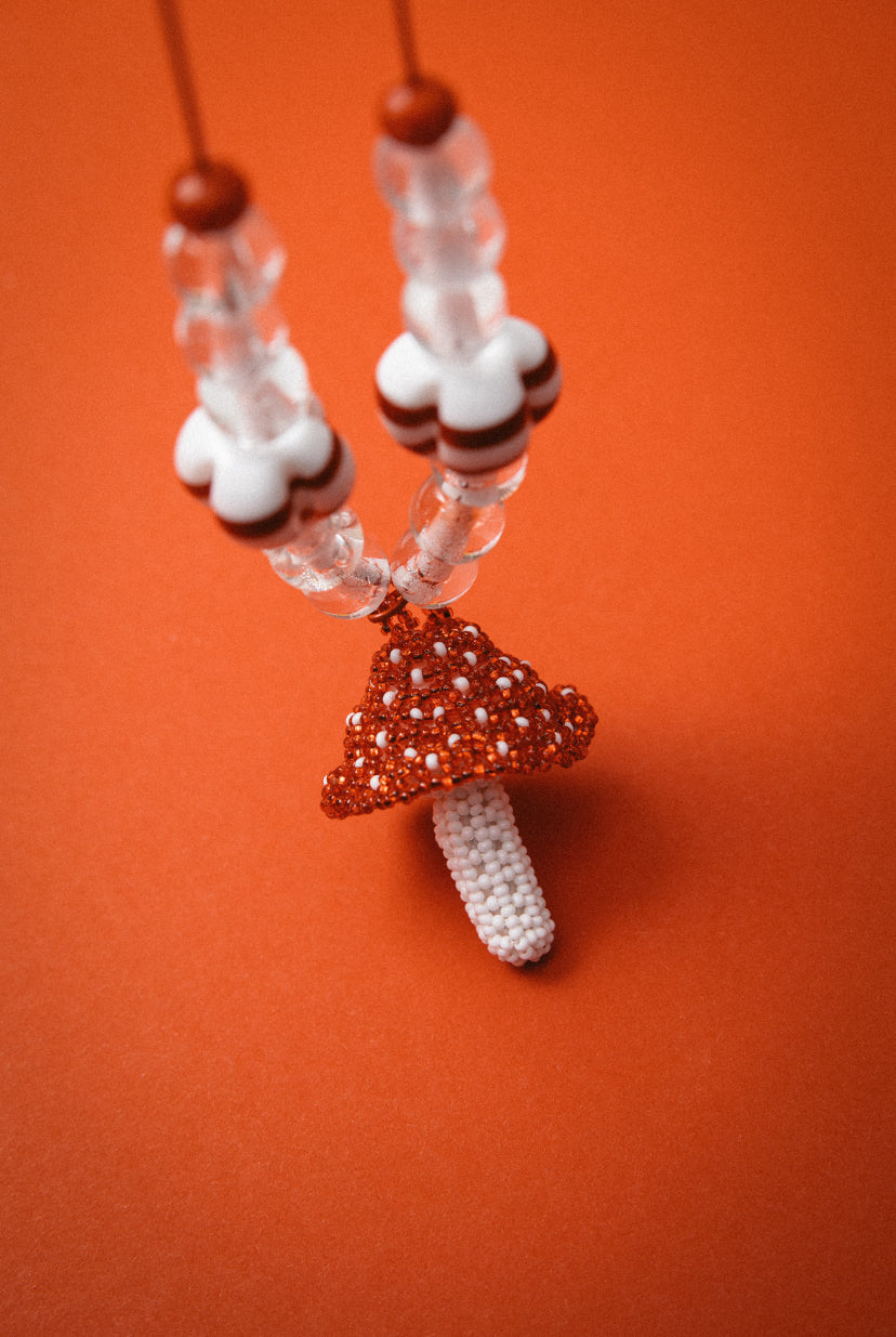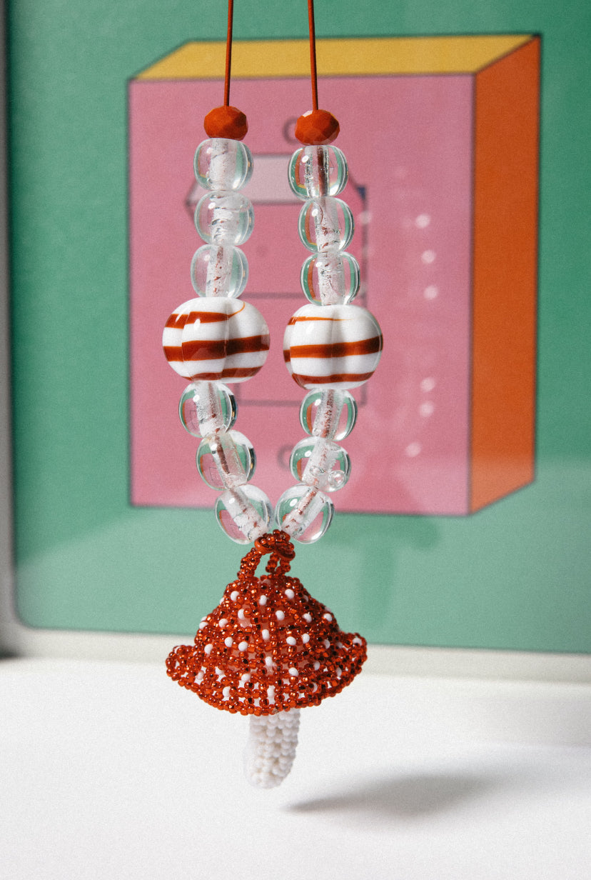 Red Greek Leather + Mushroom made of Acrylic Beads + Murano Glass+Ceramic