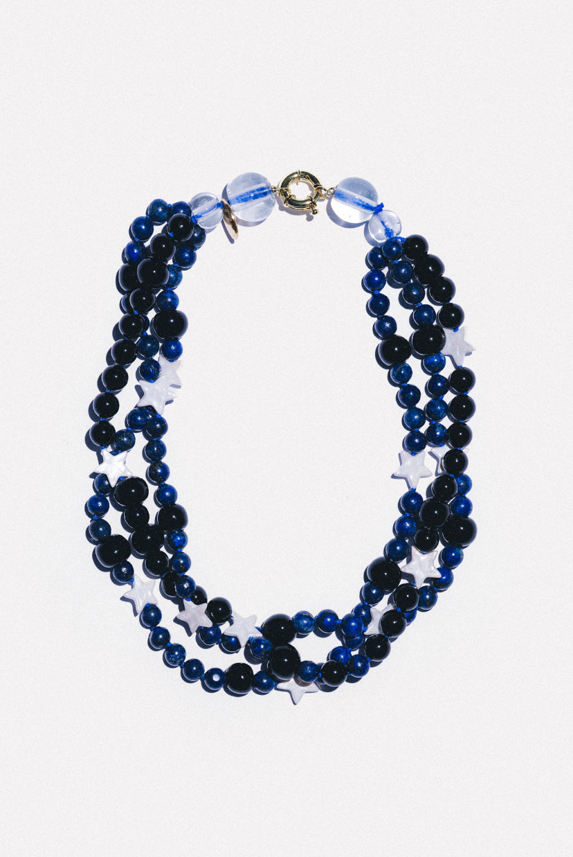 As estrelas de ágata natural, lapidadas na nossa oficina, criam uma harmonia perfeita com as esferas de ónix e lápis-lazúli naturais. Cada uma destas peças exclusivas representa um fragmento desta aventura mágica, personificando a emoção, o desejo e a beleza que se encontram na natureza. Os detalhes em metal banhado a ouro, como fechos e etiquetas, fazem parte da nossa linha de joias premium. São garantidos por um revestimento de sete camadas de ouro 18k .