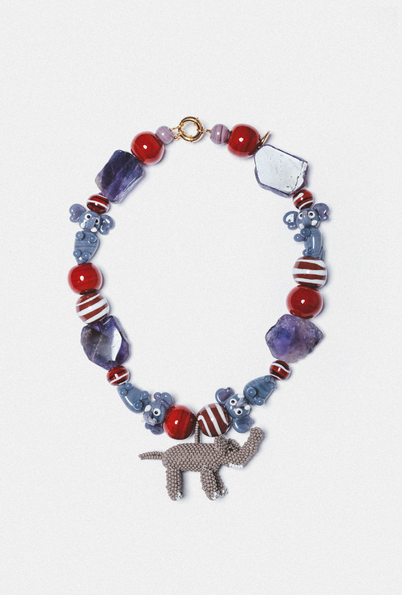 A harmonia entre as esferas listradas de Murano e as pedras de ametista natural forma um conjunto singular que, juntamente com a delicadeza do elefante esculpido em 3D, constitui uma peça exclusiva, cuidadosamente elaborada à mão na nossa oficina. Os detalhes em metal banhado a ouro, como os fechos e as etiquetas, fazem parte da nossa linha de joias premium.