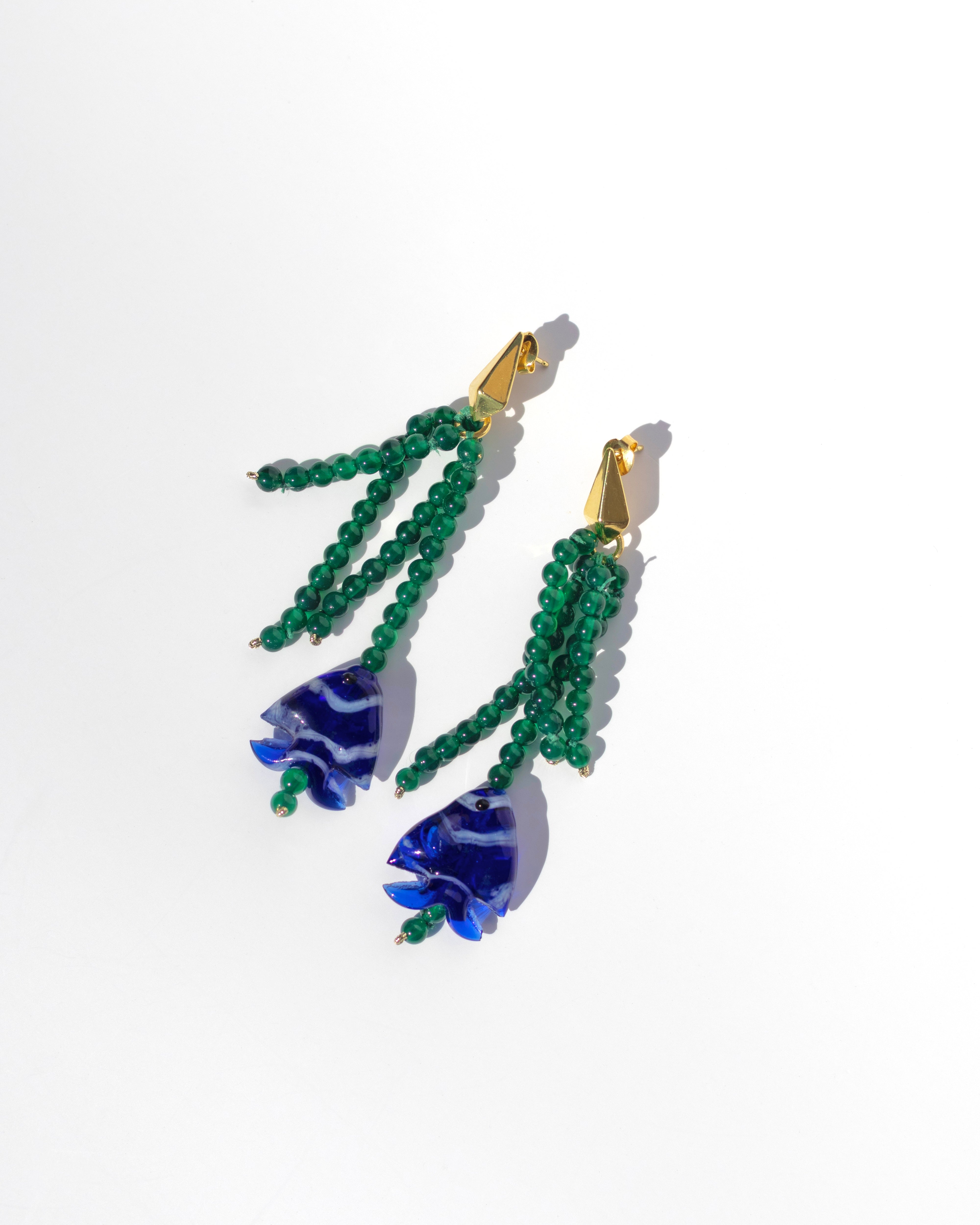 Natural Jade Stone +Murano Glass Fish+Stainless Steel Ring + 18k Gold Plating