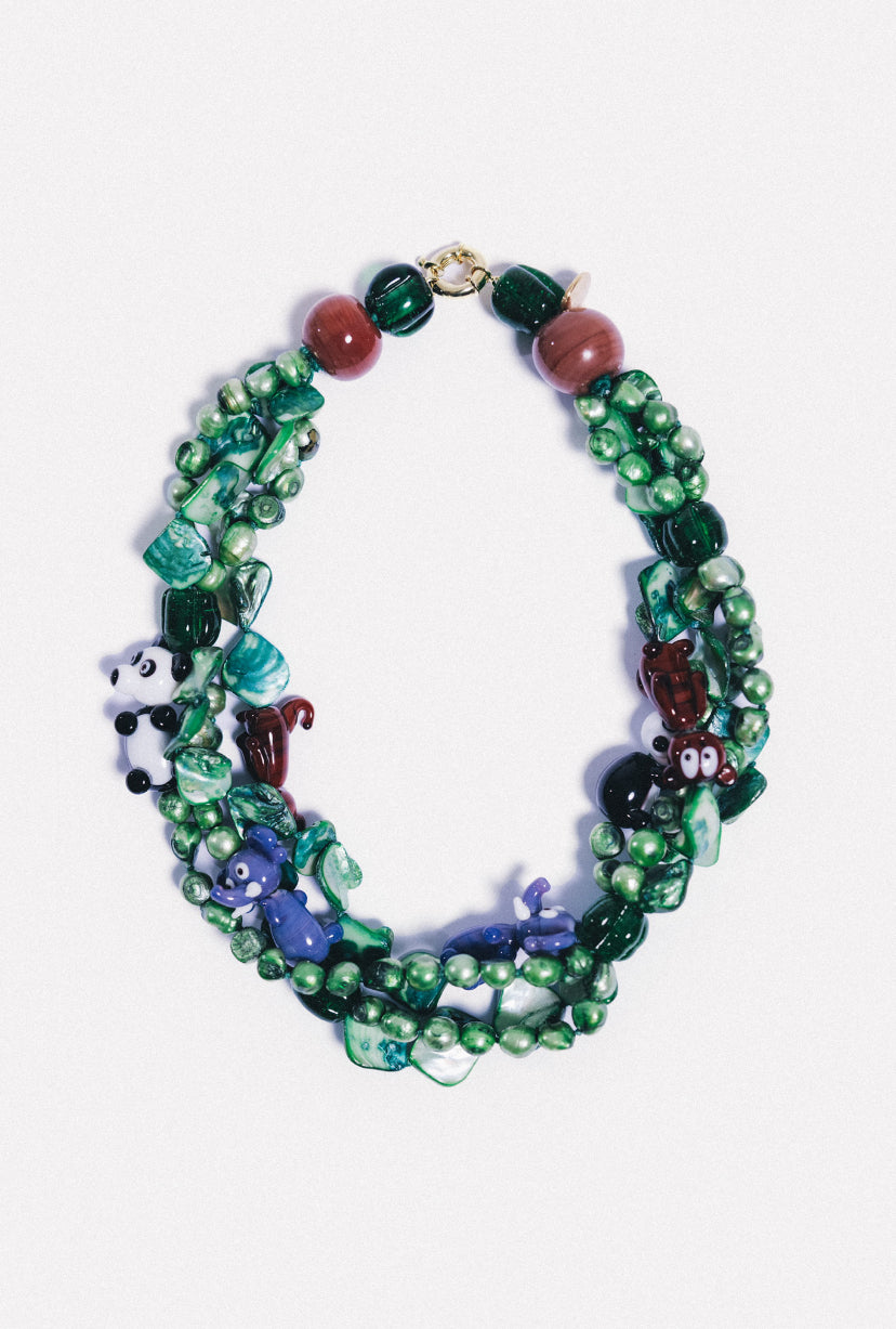 As esferas de Murano, em harmonia com a doçura dos animais, são peças exclusivas, cuidadosamente trabalhadas e pintadas à mão na nossa oficina. As pérolas naturais, tingidas de verde, simbolizam a riqueza e a diversidade da vegetação da Amazónia. Cada uma destas peças representa um fragmento desta aventura mágica, incorporando a emoção, o desejo e a beleza que se encontram na natureza. Os detalhes em metal banhado a ouro, como fechos e etiquetas, fazem parte da nossa linha de joias premium. A qualidade destas peças é garantida por um revestimento de sete camadas de ouro de 18 quilates.