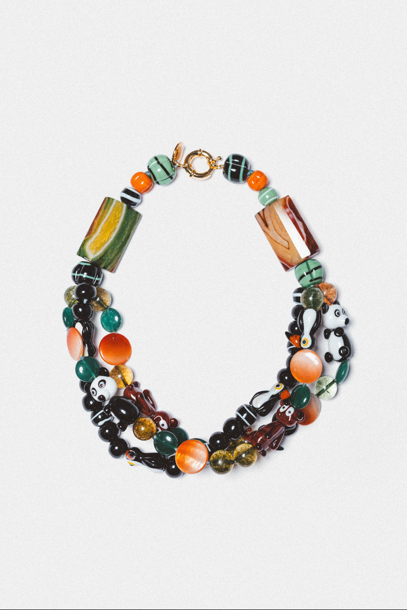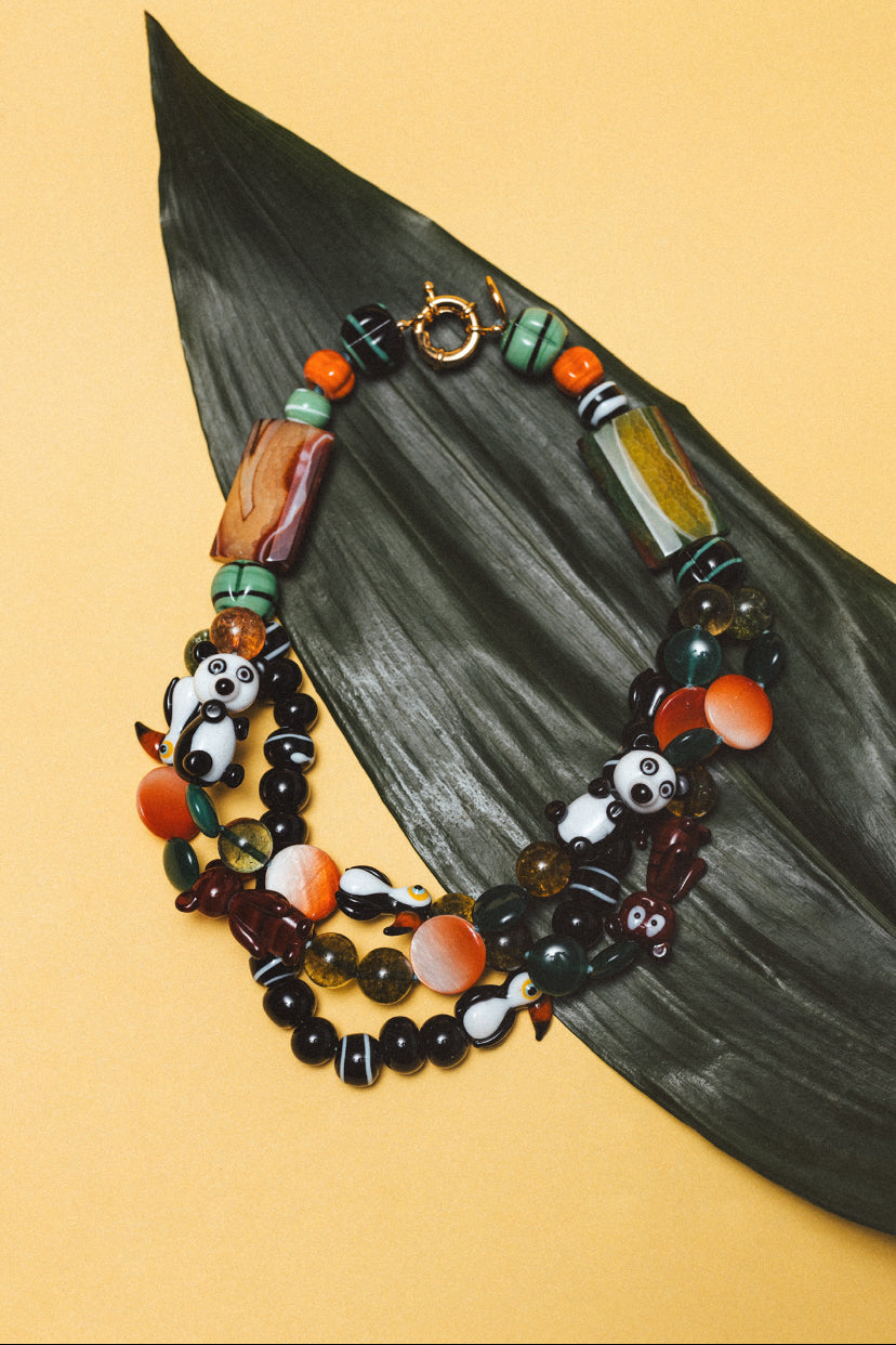Pedras naturais de ónix, citrino e ágata + madrepérola tingida + animais em vidro de Murano + esferas de cerâmica + fecho em aço inoxidável banhado a ouro 18k