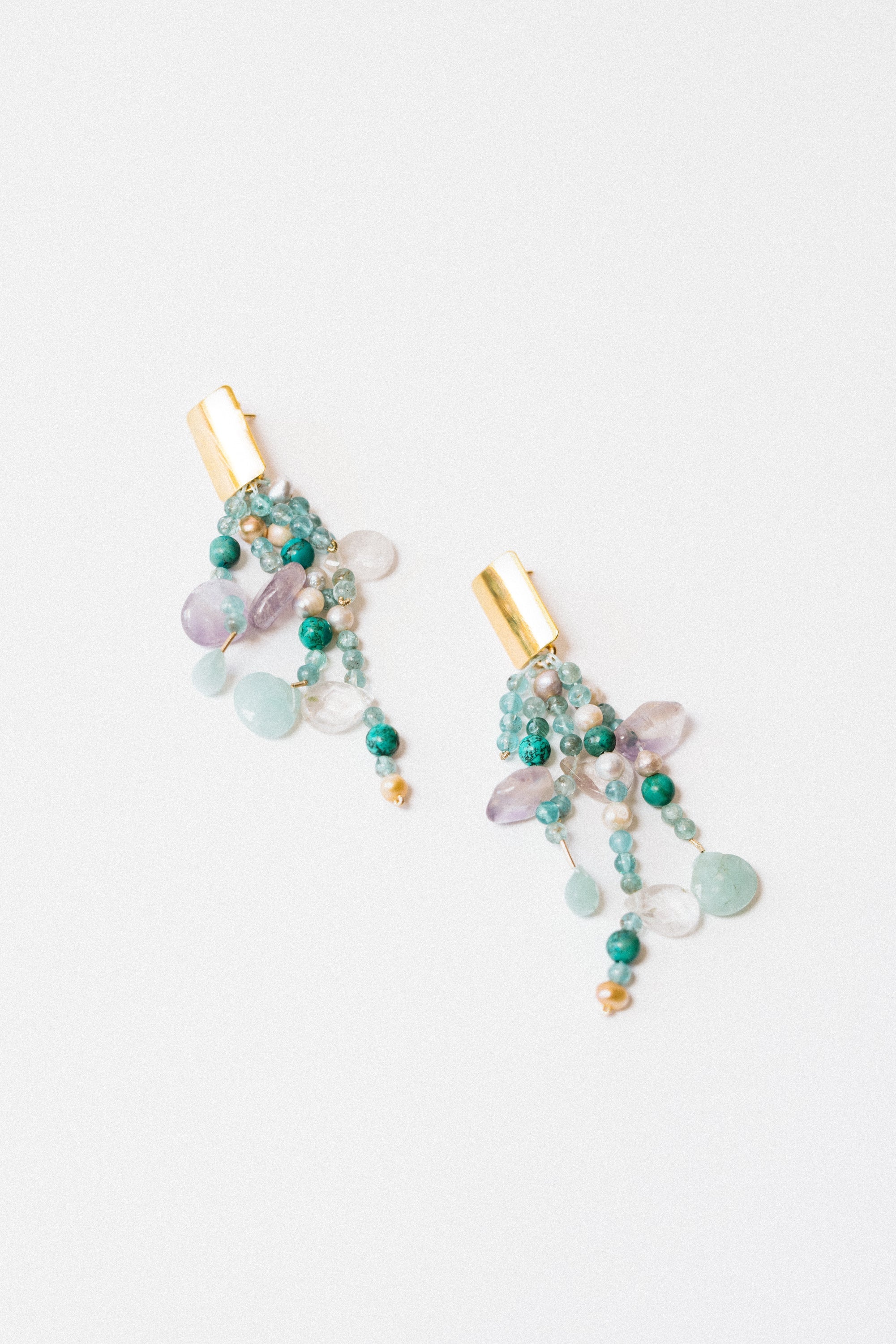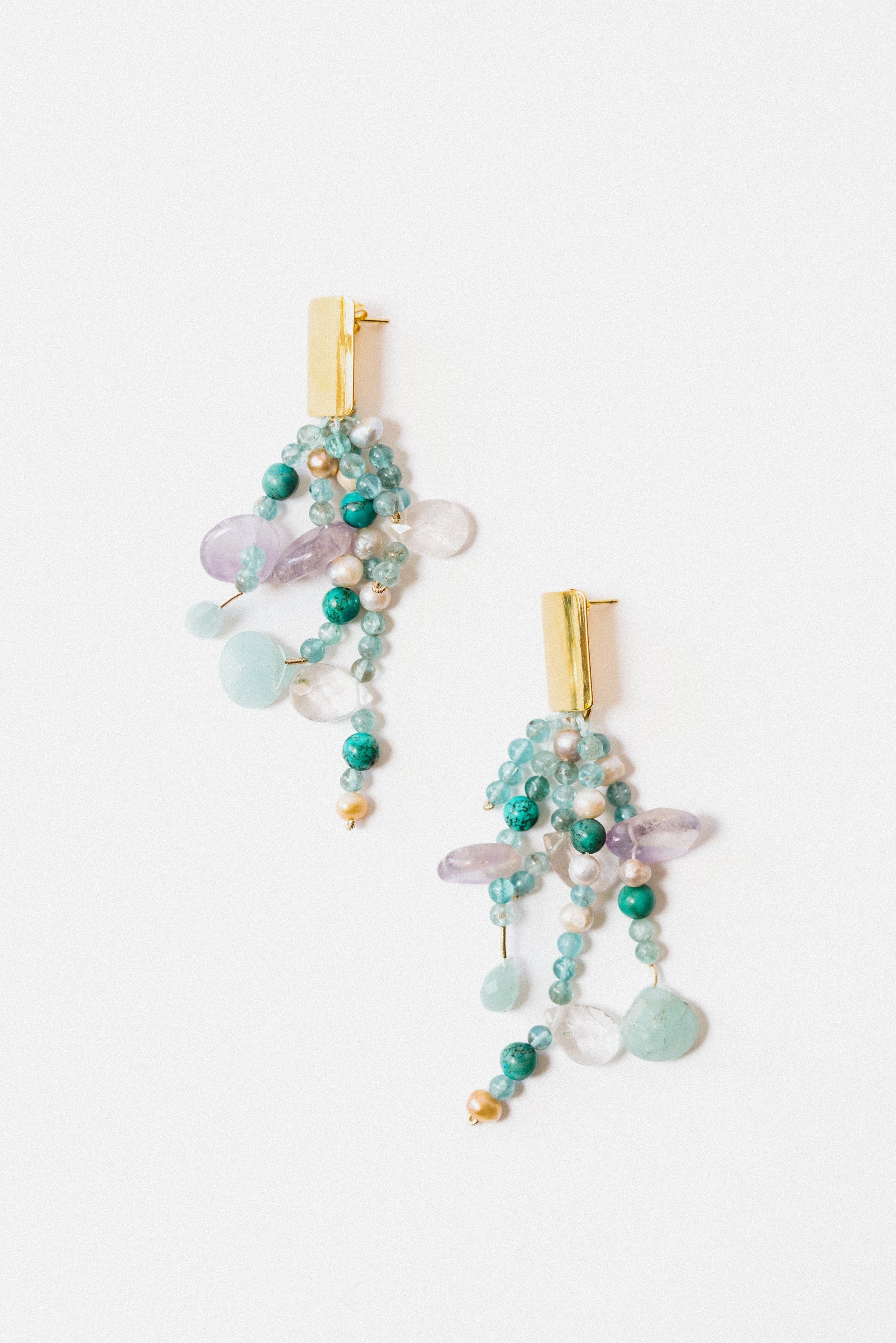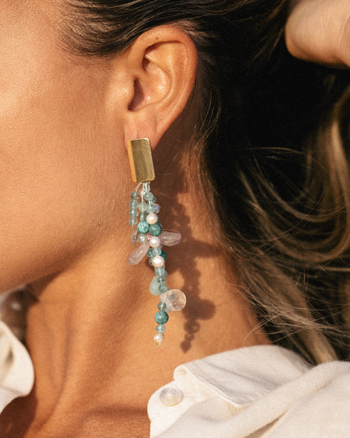 Pedras Naturais de Turquesa, Água Marinha, Ametista, Cristais de Quatzo, Pérolas Naturais + Ágatas / Argolas em Aço inoxidável + banho em ouro 18k