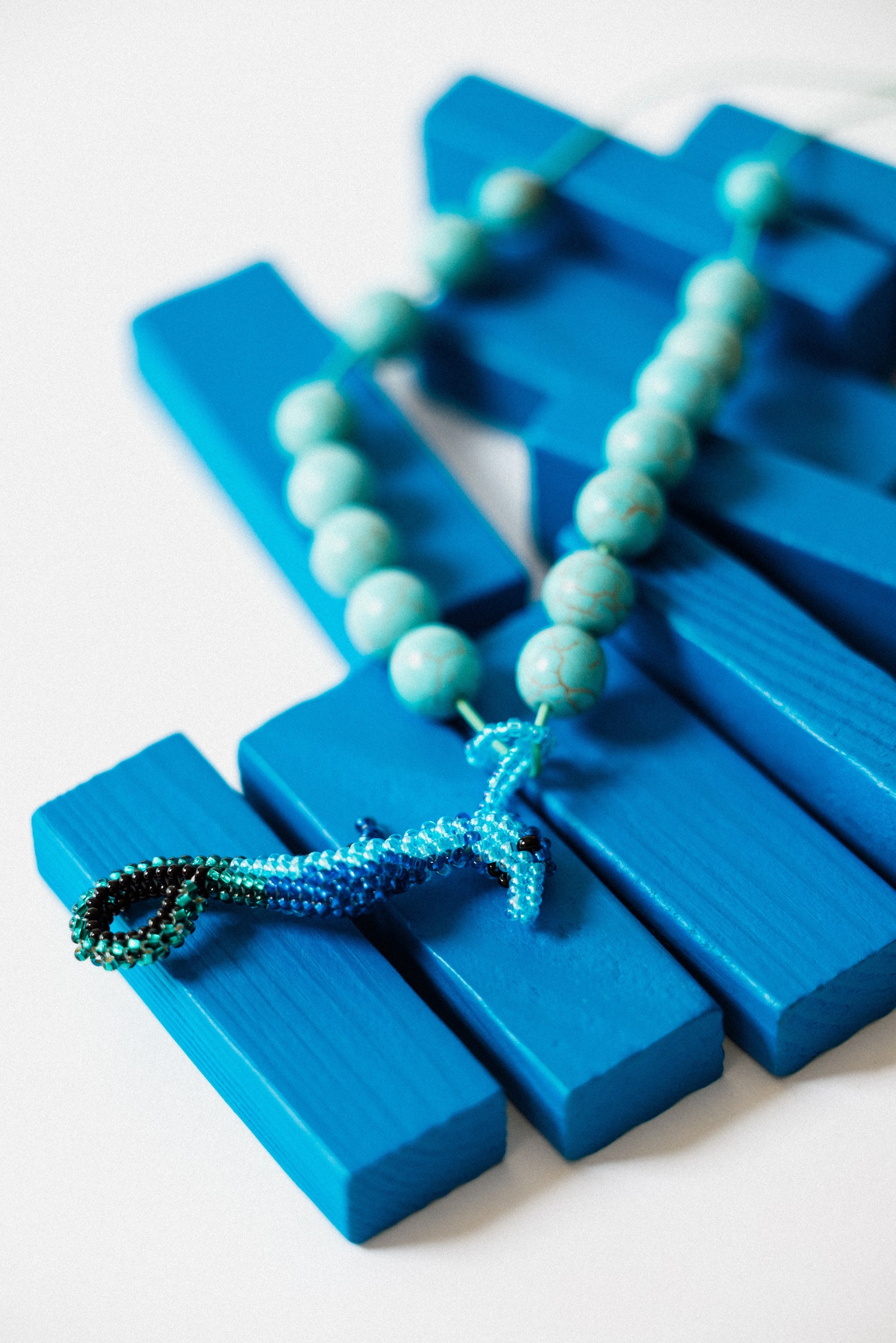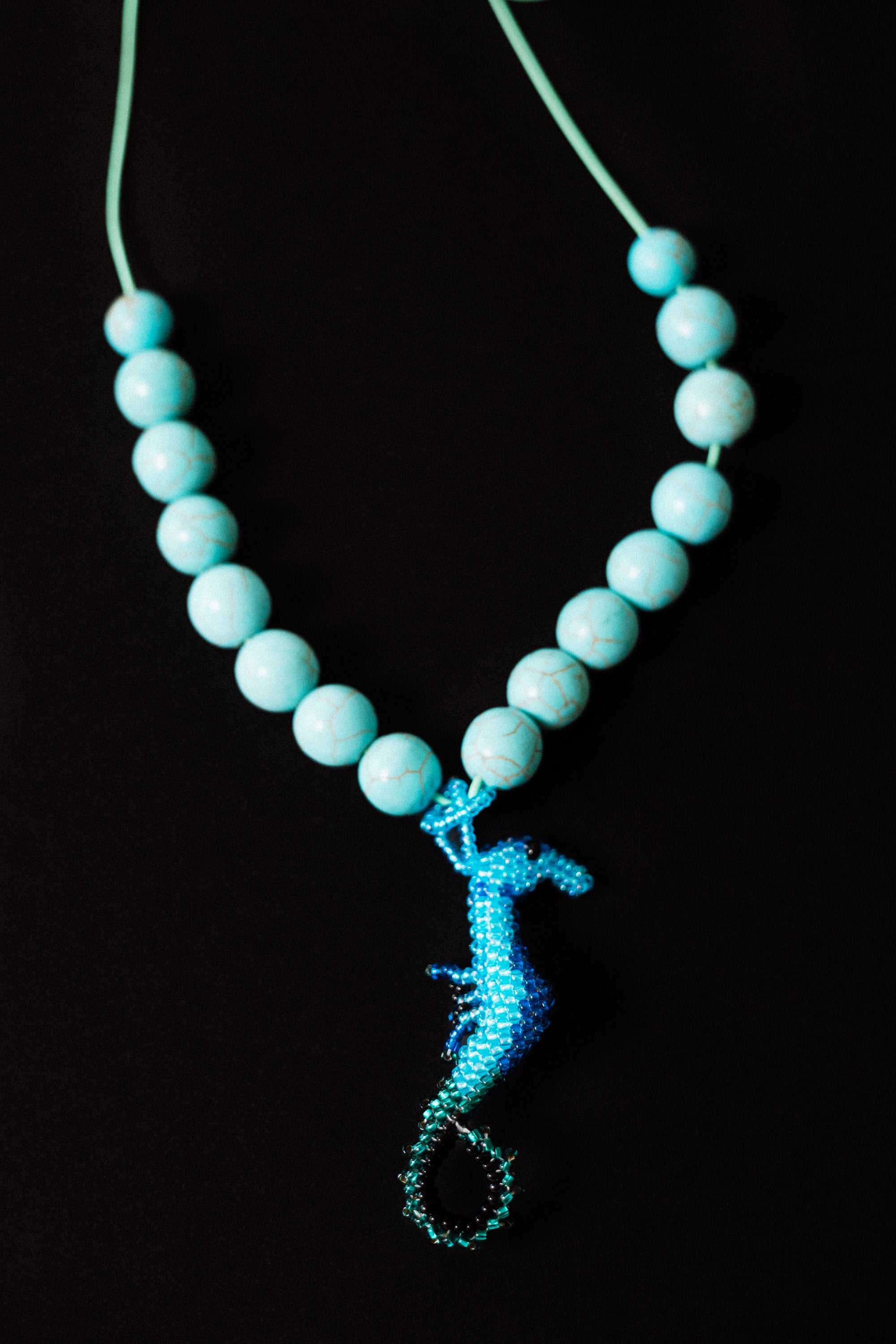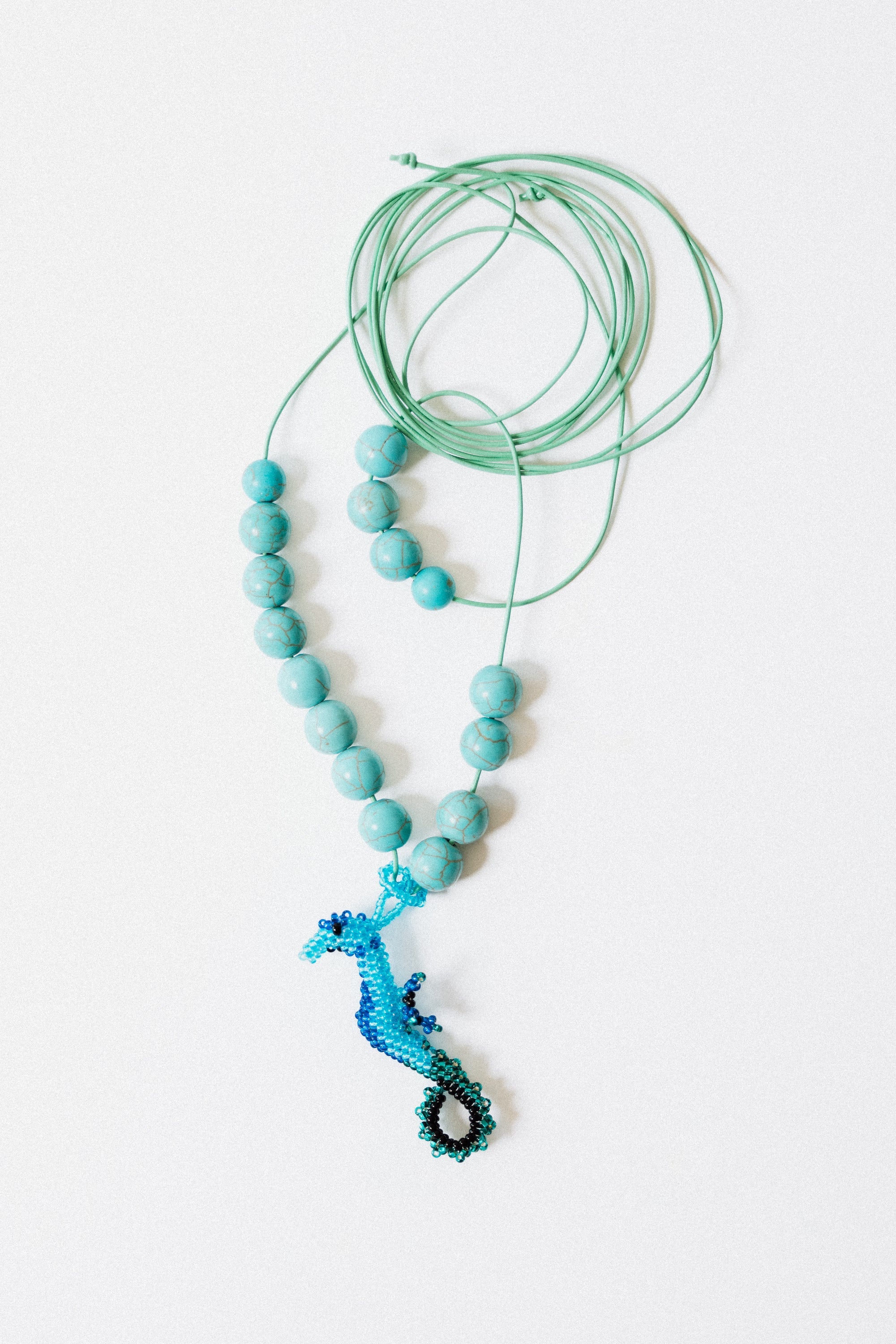 Couro Grego Verde + Cavalo marinho Contas em acrílico + Esferas de Turquesa