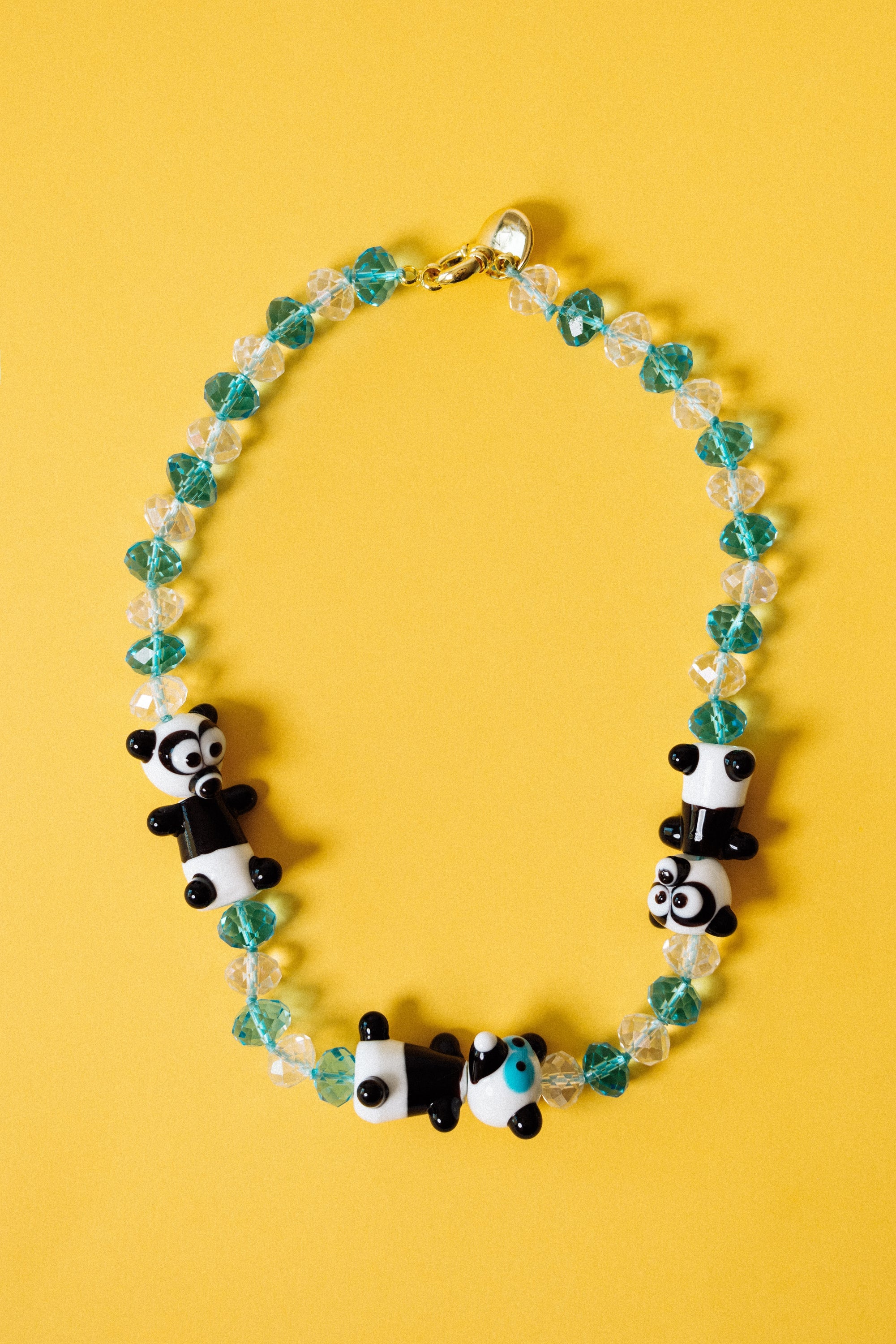 Urso Panda em Murano de vidro + Esferas de cristal / Fecho em Aço inoxidável + banho em ouro 18k