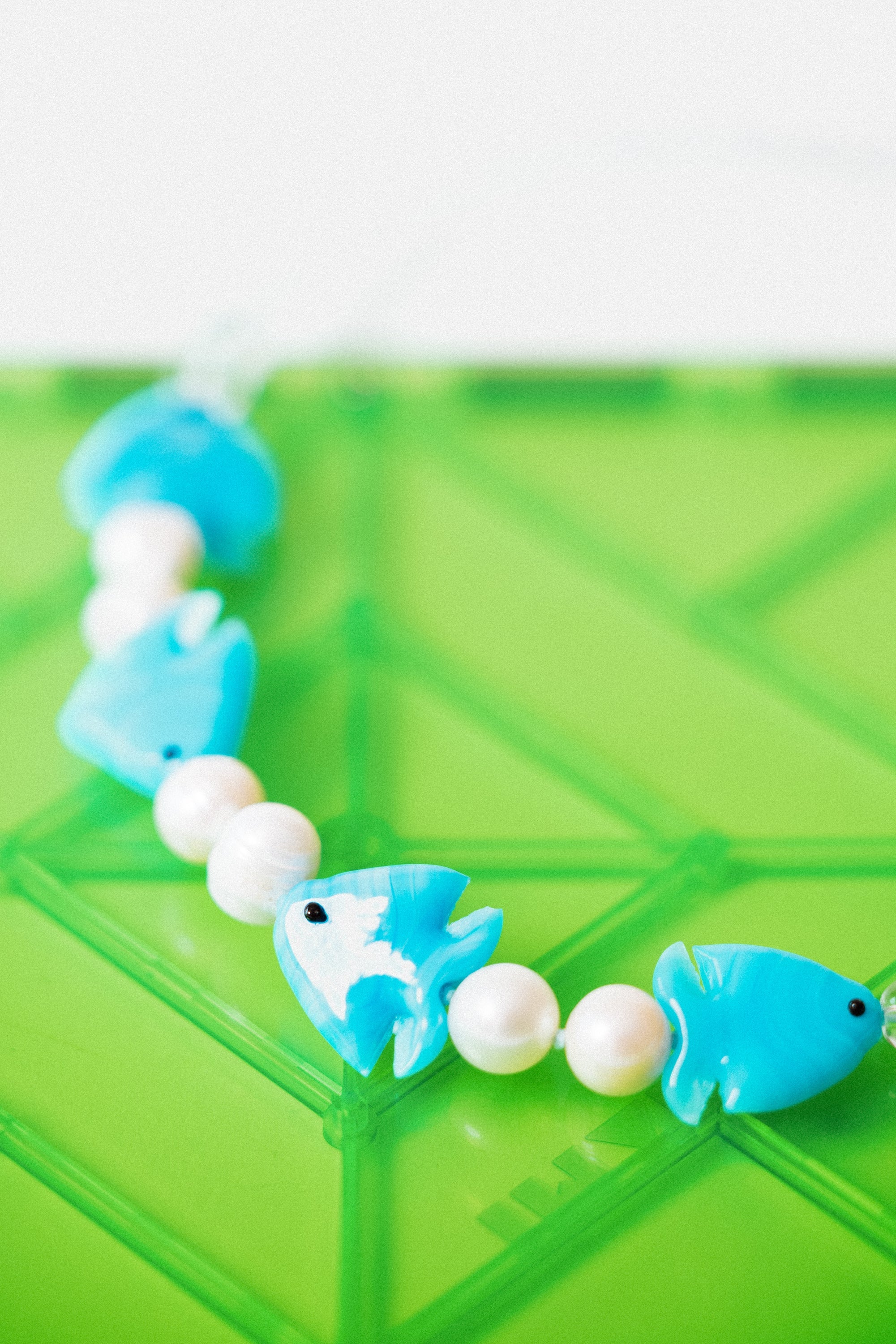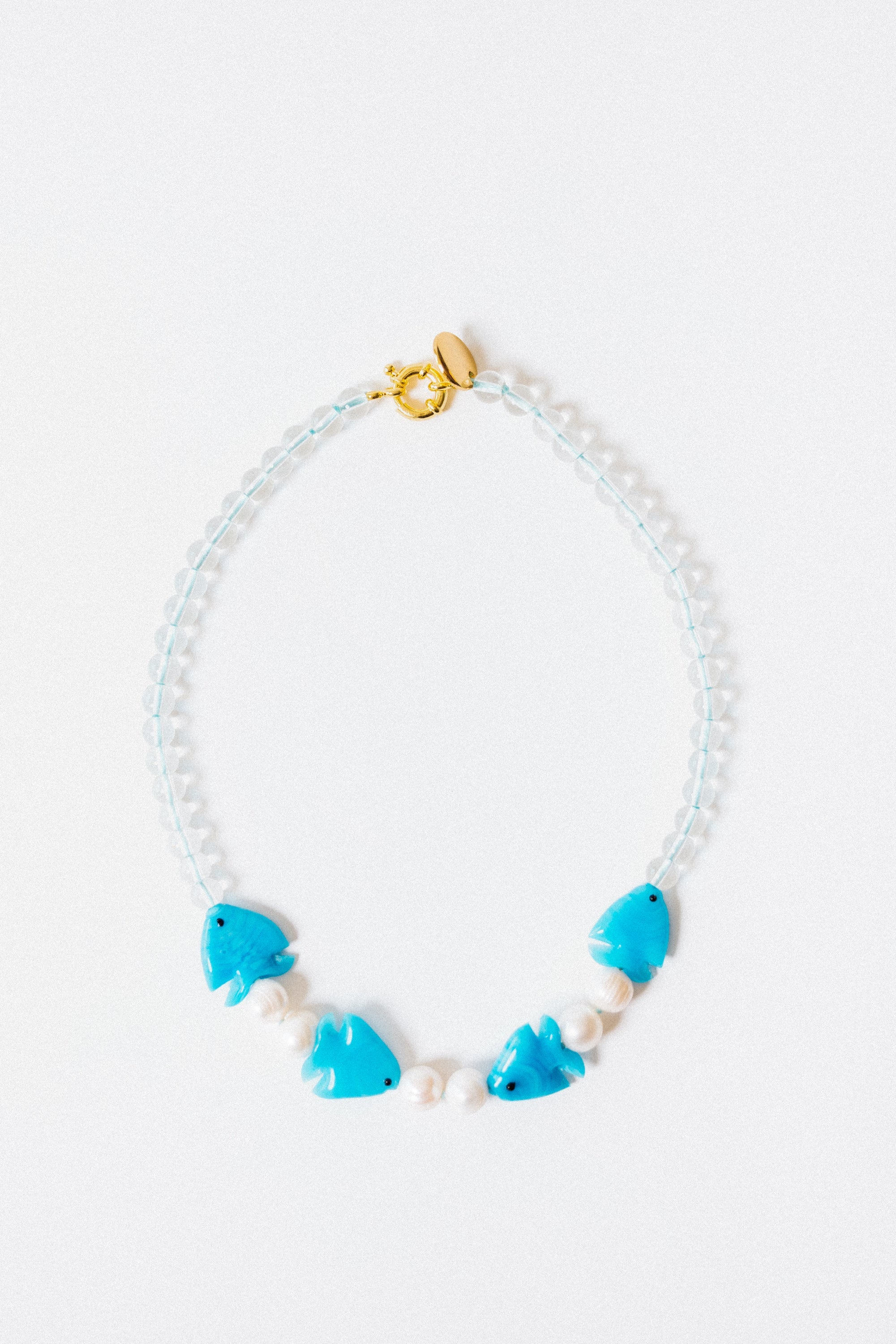 Peixes em Murano de vidro + Esferas de Cristal + Pérolas 100% Naturais / Fecho em Aço inoxidável + banho em ouro 18k