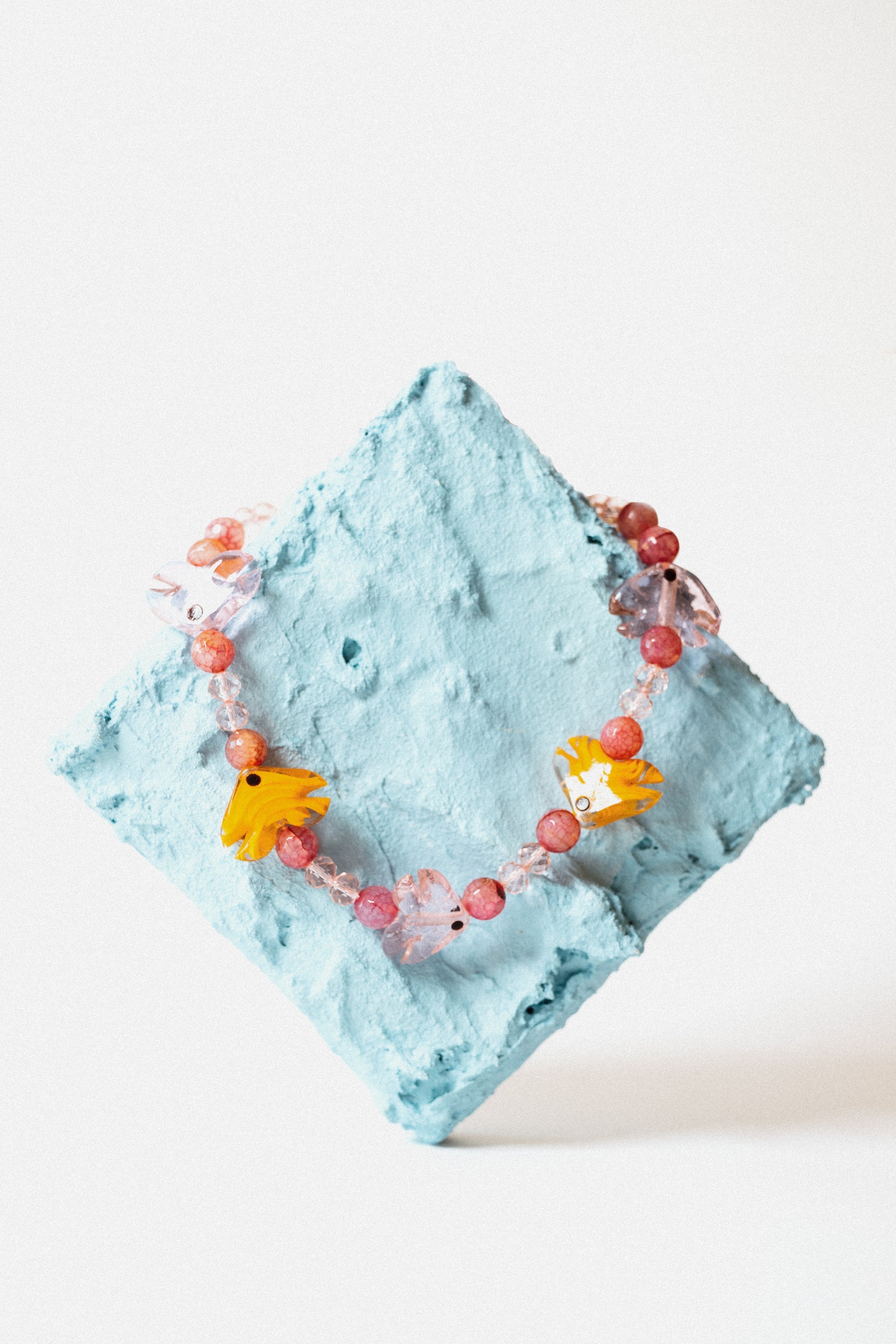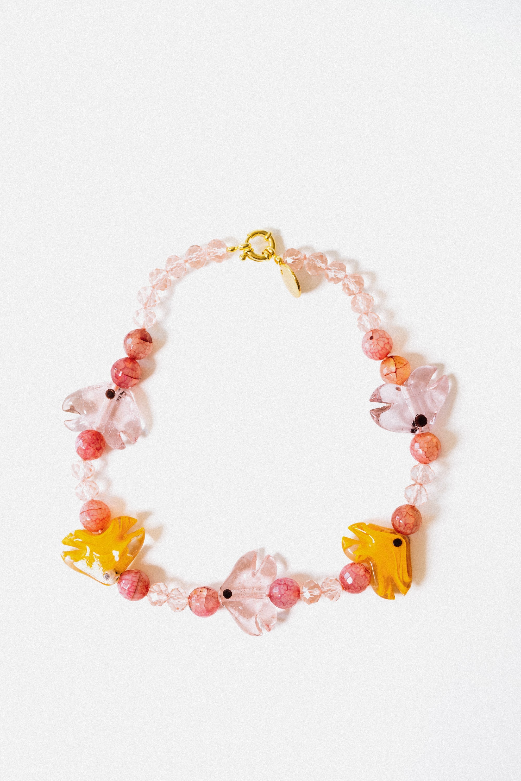 Peixes em Murano de vidro + Esferas de Cristal + Pedras Naturais Fluoritas / Fecho em Aço inoxidável + banho em ouro 18k