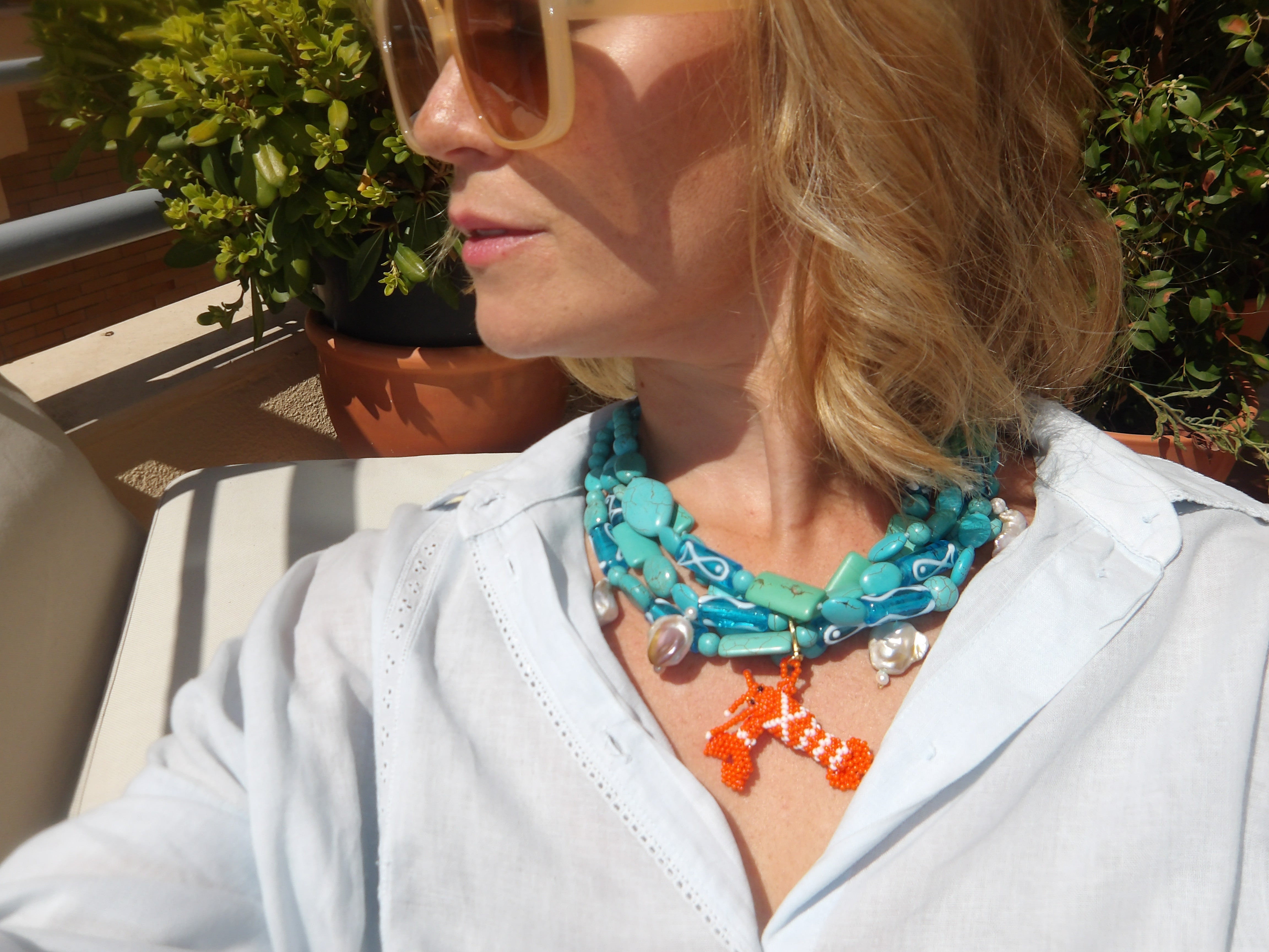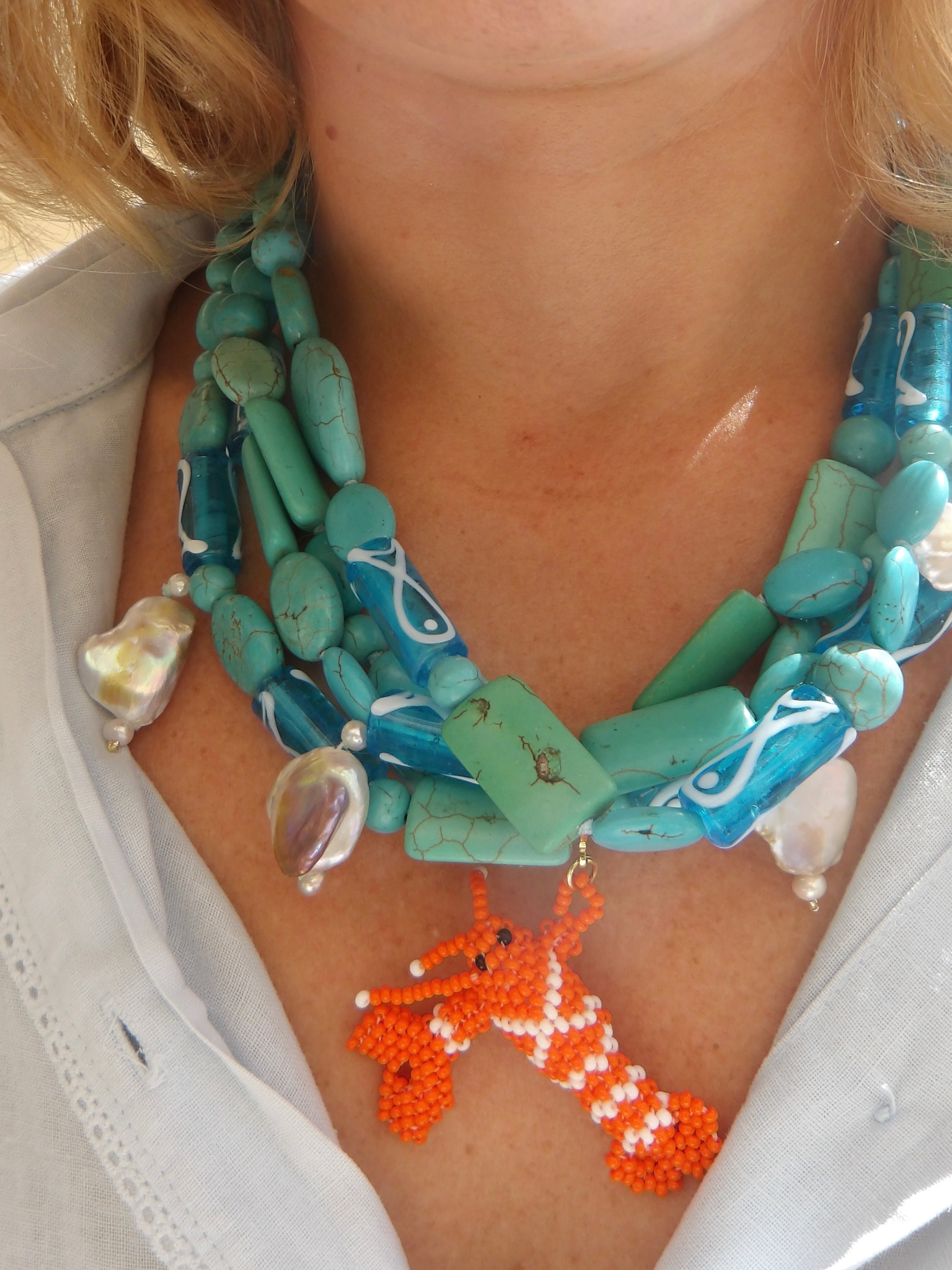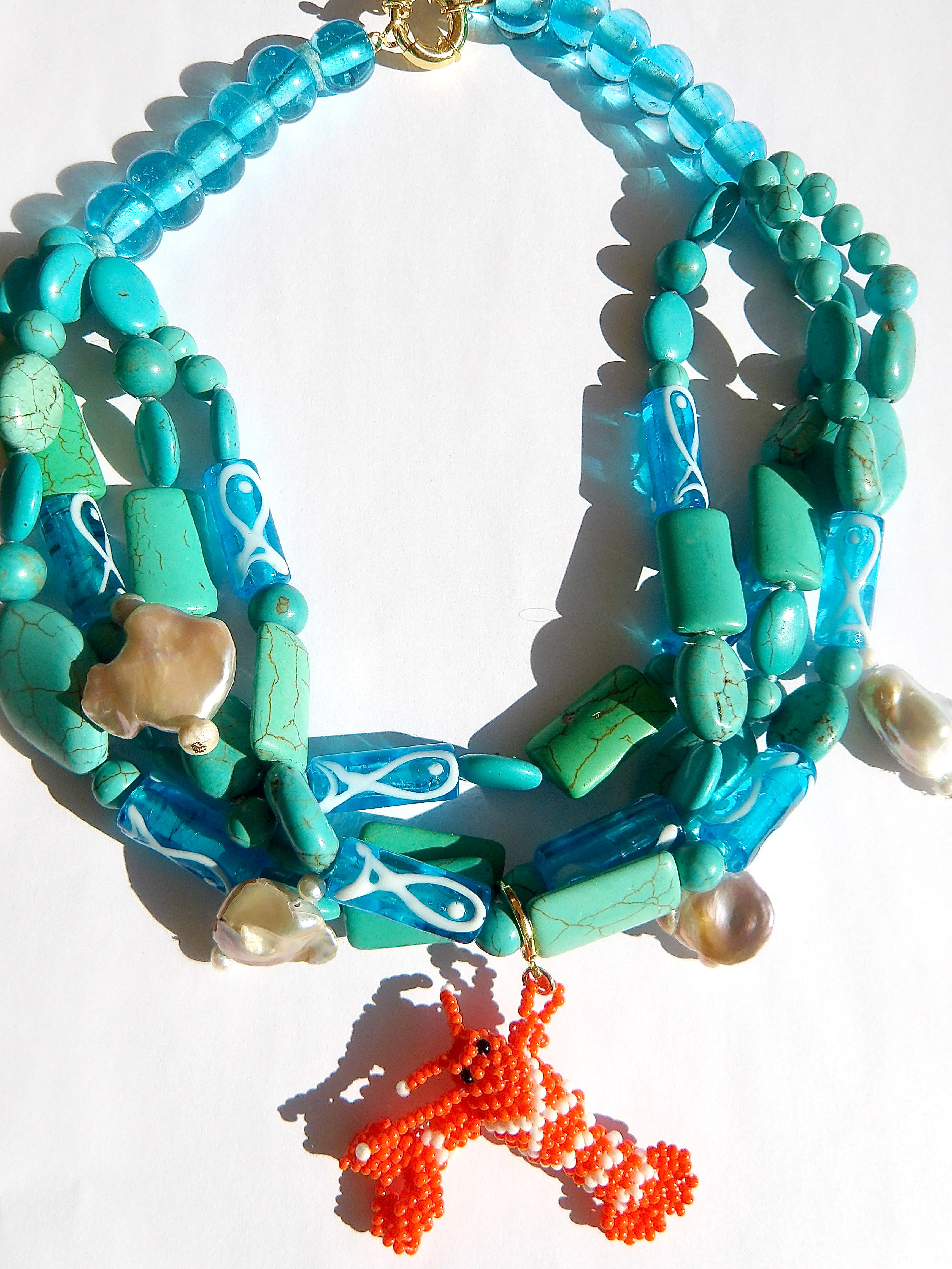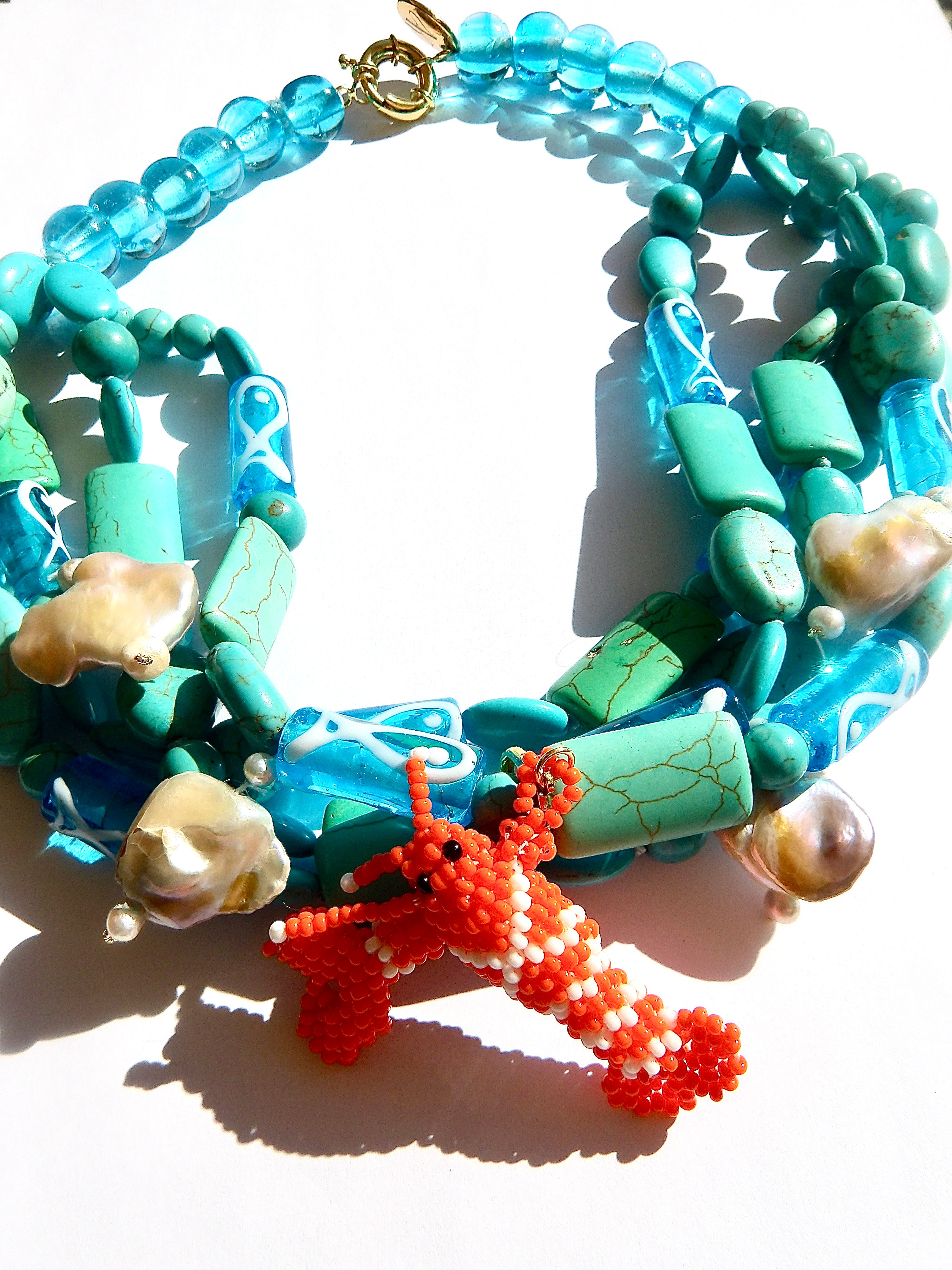 Lavagante feito de contas de acrílico + pedra turquesa natural + pérolas e madrepérolas + vidro de Murano Fecho em aço inoxidável com banho de ouro 18k