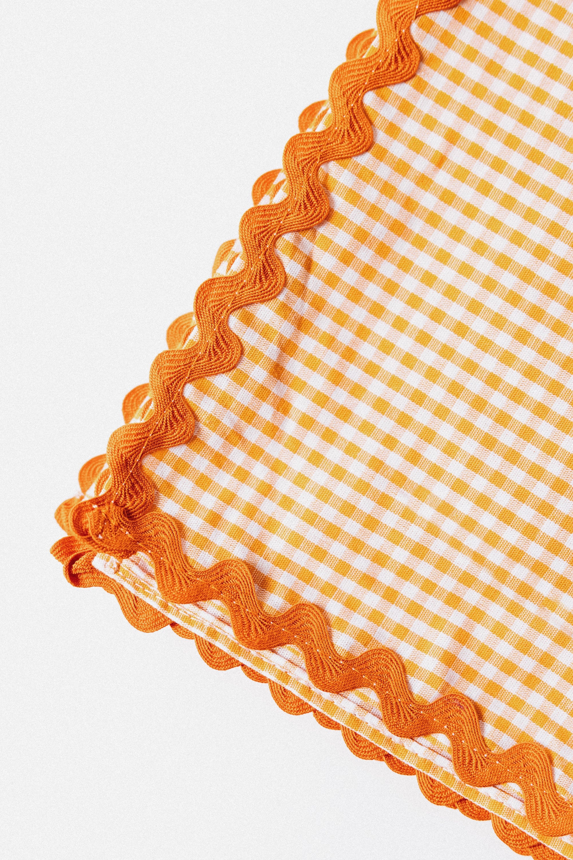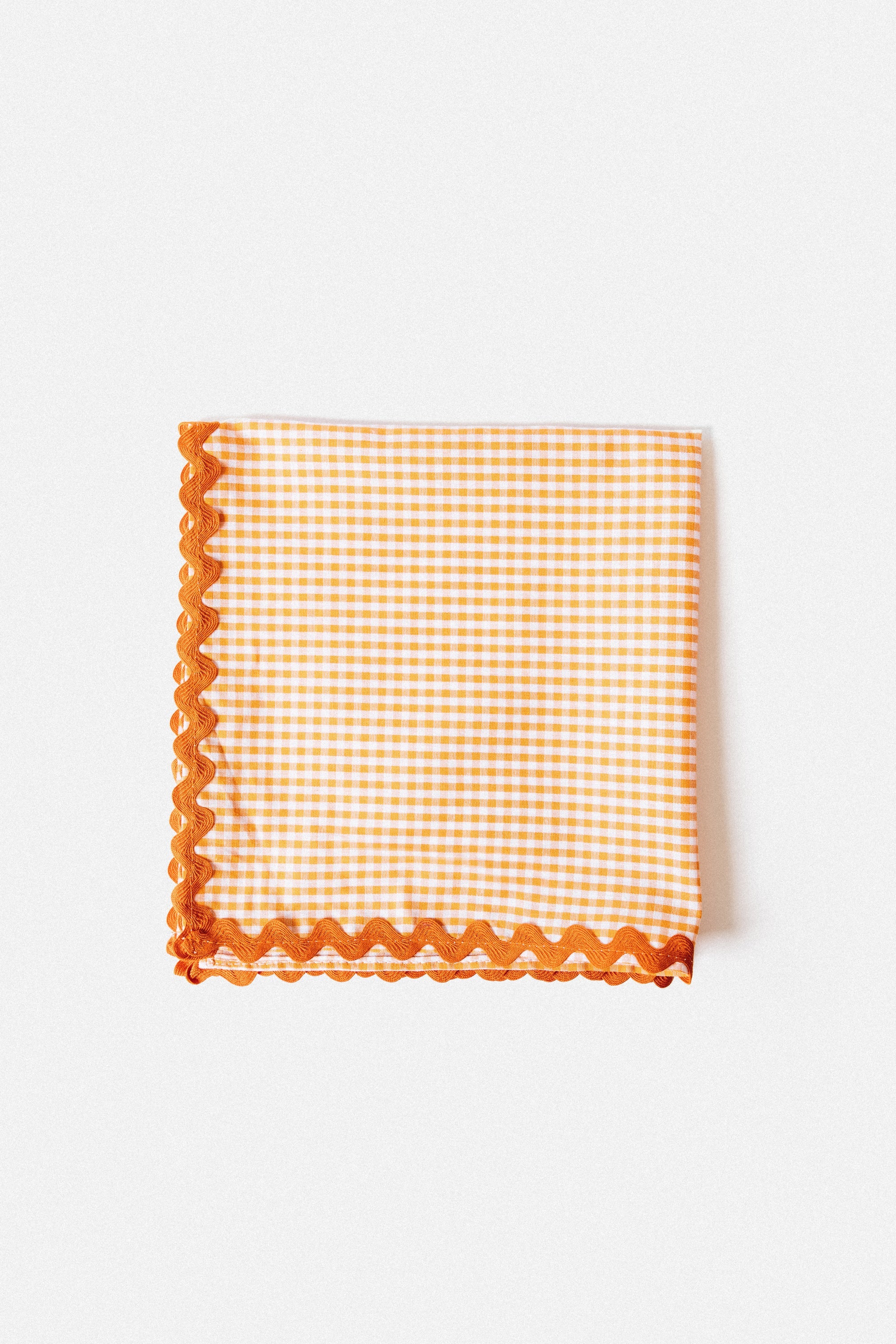 Guardanapo quadrado em xadrez Vichy laranja e branco com uma borda laranja. Apresenta um acabamento branco à volta. Feito à mão com todo o nosso amor, em Portugal.
