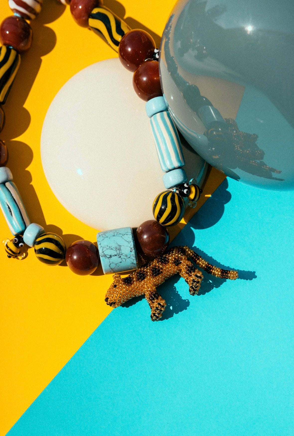 O vidro de Murano listrado e os elementos em forma de abelha, juntamente com as formas geométricas, todos meticulosamente esculpidos em pedra-sabão no nosso ateliê, são peças exclusivas que criam uma harmonia divertida com o leopardo 3D, feito de contas acrílicas. Cada peça representa um fragmento desta aventura mágica. Os detalhes metálicos banhados a ouro são garantidos por um revestimento de sete camadas de ouro de 18 quilates.