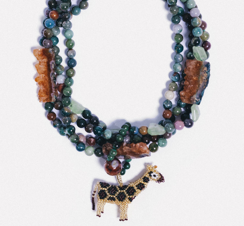 As pedras naturais de Ágata, em harmonia com as pedras naturais de Quartzo, são peças exclusivas, cuidadosamente criadas e polidas na nossa oficina.A Girafa meticulosamente esculpida à mão, com o seu volume e formato distintos, é uma peça divertida criada através do nosso projeto social com artesãos na Colômbia. Cada uma destas peças representa um fragmento desta aventura mágica, incorporando a emoção, o desejo e a beleza que se encontram na natureza. Os detalhes em metal banhado a ouro, como fechos e etiquetas, fazem parte da nossa linha de joias premium. A sua qualidade é garantida por um revestimento de sete camadas de ouro de 18 quilates.