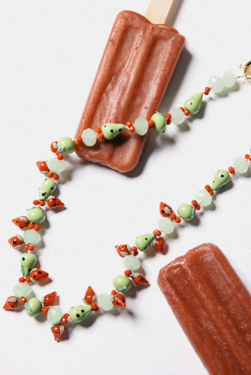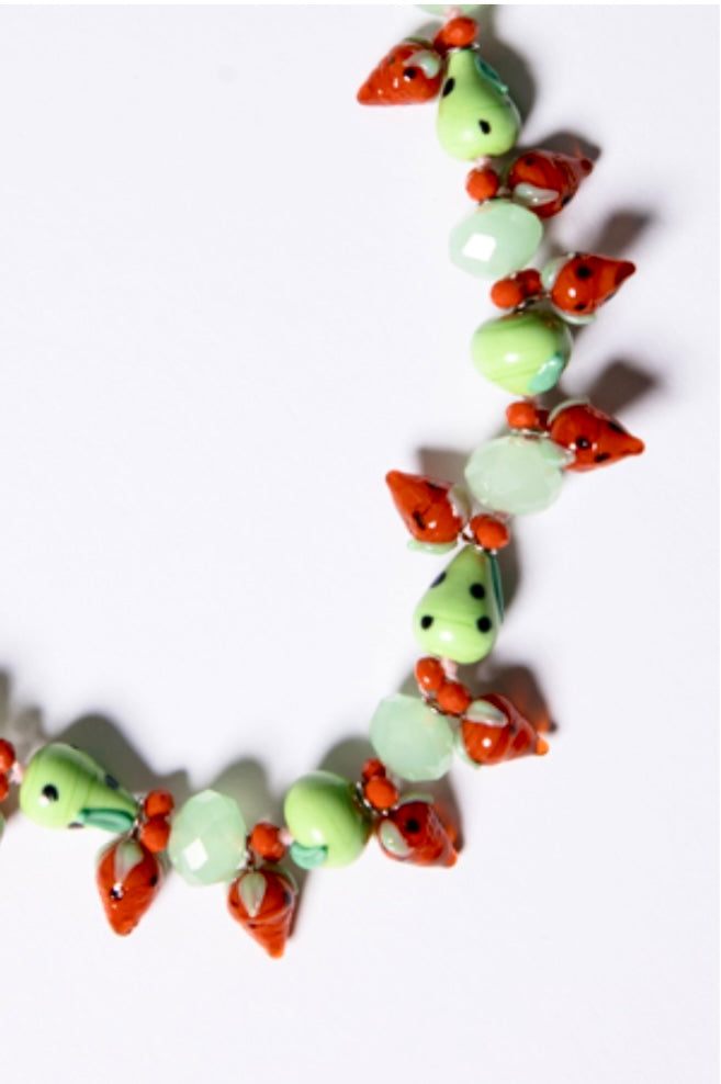 Murano glass Watermelon + Crystal spheres / Stainless steel clasp with 18k gold plating