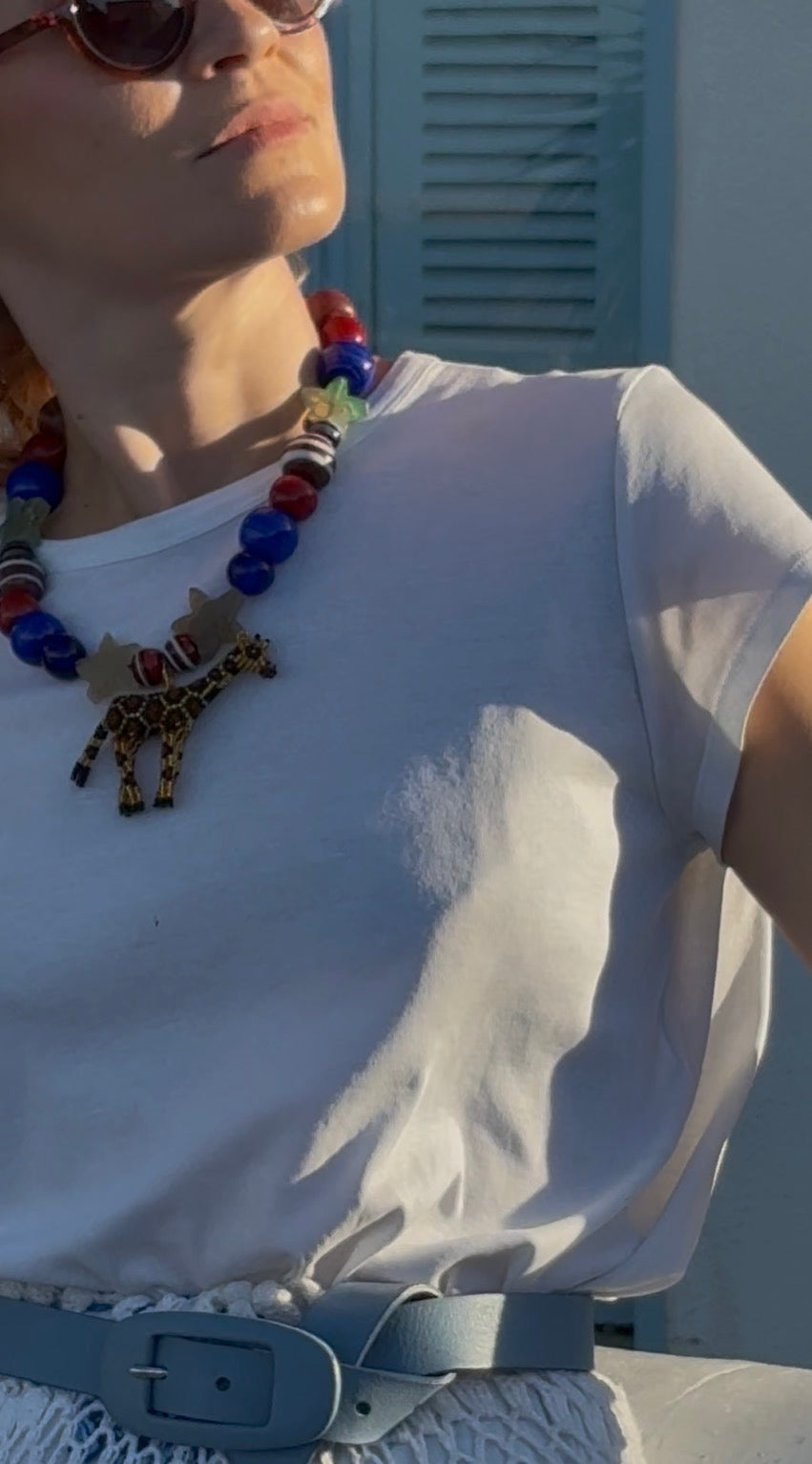 A harmonia lúdica entre as esferas de Murano e as estrelas de ágata natural forma um conjunto singular que, juntamente com a delicadeza da girafa esculpida em 3D, constitui uma peça exclusiva, cuidadosamente elaborada à mão na nossa oficina. Os detalhes em metal banhado a ouro, como os fechos e as etiquetas, fazem parte da nossa linha de joias premium.