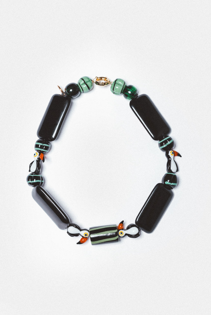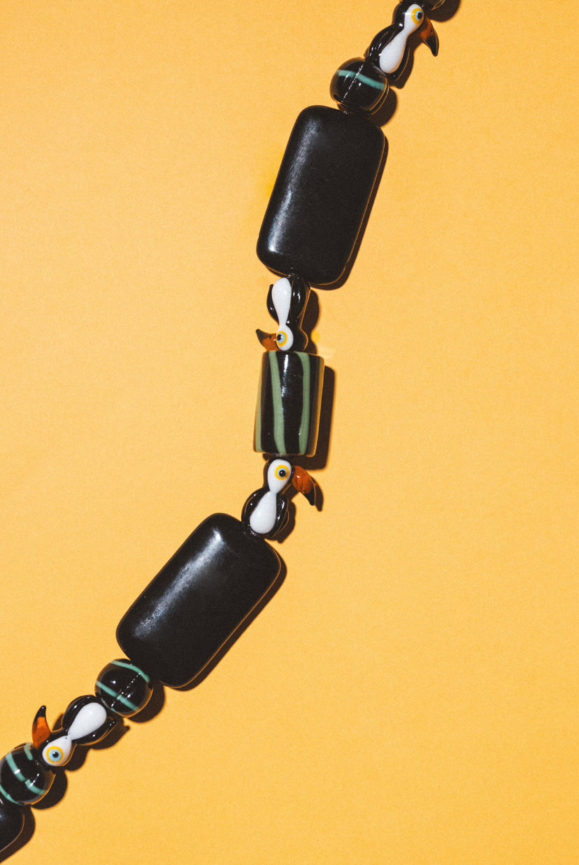 A harmonia lúdica entre pedras naturais e esferas de cerâmica, formando um conjunto geométrico singular, aliada à delicadeza do tucano de vidro de Murano, compõe peças exclusivas, cuidadosamente elaboradas à mão na nossa oficina. Os detalhes em metal banhado a ouro, como fechos e etiquetas, fazem parte da nossa linha de joias premium.