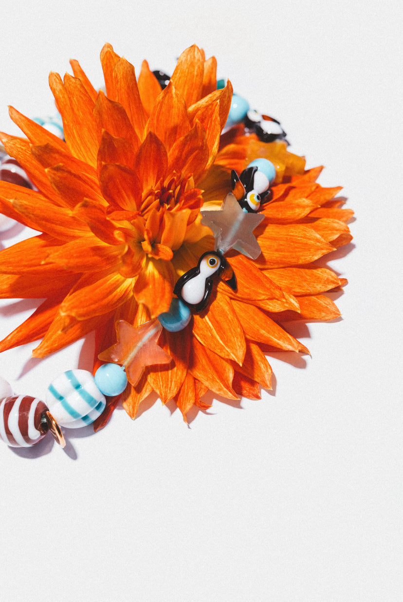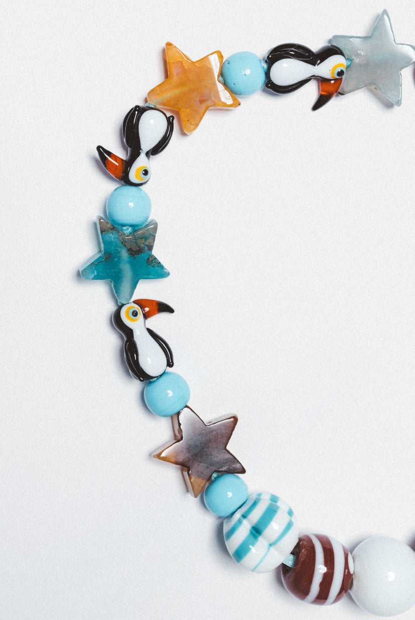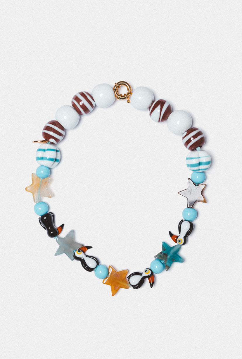 As esferas listradas de Murano, em harmonia com as estrelas de ágata natural e a delicadeza dos tucanos de Murano, são peças exclusivas, cuidadosamente elaboradas e pintadas à mão na nossa oficina. Os detalhes em metal banhado a ouro, como fechos e etiquetas, fazem parte da nossa linha de joias premium.